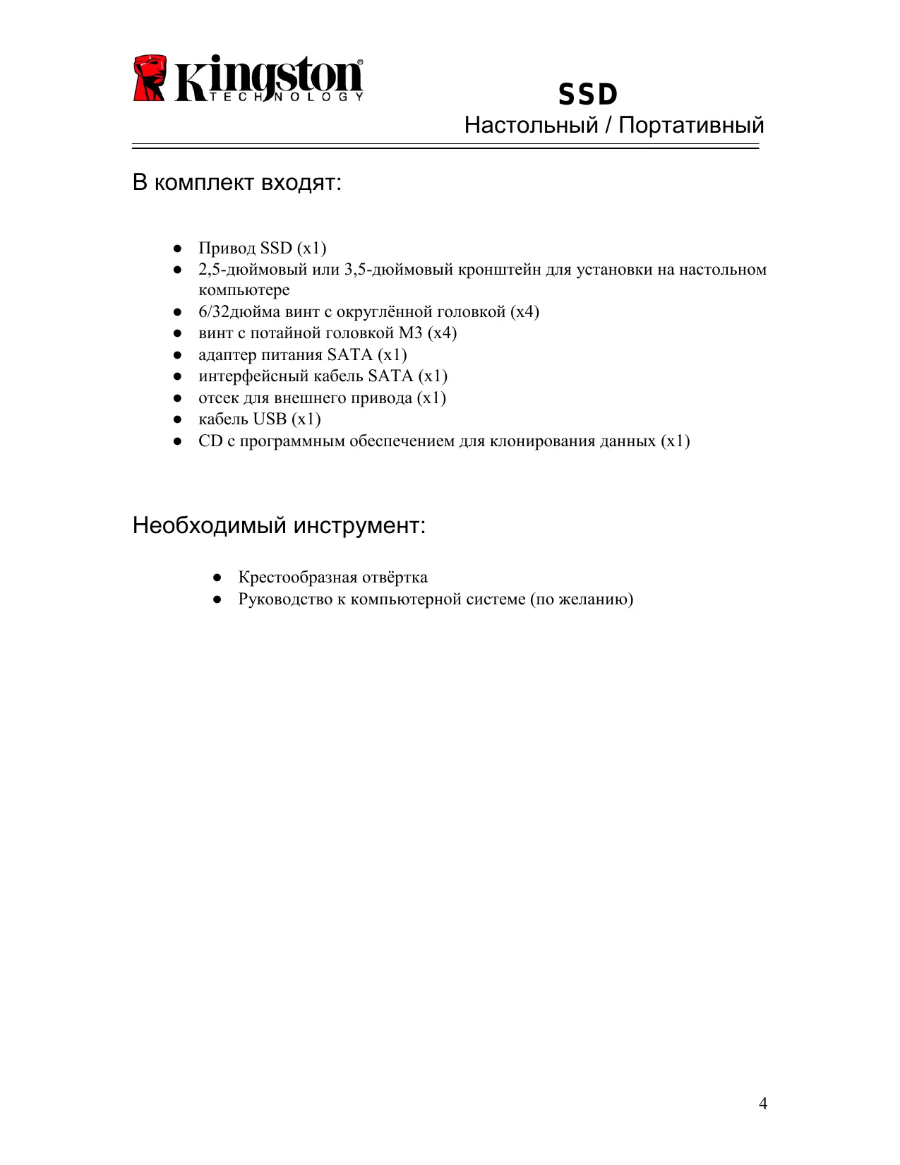 SSD Настольный / Портативный В комплект входят: ● Привод SSD (x1) ● 2,5-дюймовый или 3,5-дюймовый кронштейн для установки на настольном компьютере ● 6/32дюйма винт с округлѐнной головкой (x4) ● винт с потайной головкой M3 (x4) ● адаптер питания SATA (x1) ● интерфейсный кабель SATA (x1) ● отсек для внешнего привода (x1) ● кабель USB (x1) ● CD с программным обеспечением для клонирования данных (x1)