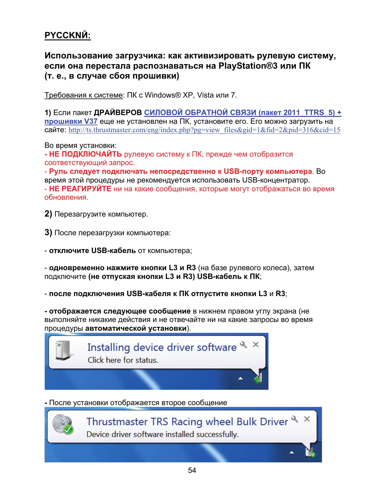 PYCCKNЙ: Использование загрузчика: как активизировать рулевую систему, если она перестала распознаваться на PlayStation®3 или ПК (т. е., в случае сбоя прошивки) Требования к системе: ПК с Windows® XP, Vista или 7.