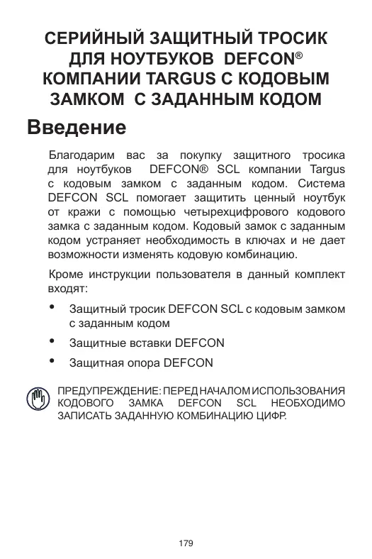 РУКОВОДСТВО ПОЛЬЗОВАТЕЛЯ NOTEBOOK SECURITY DEFCON SCL TARGUS