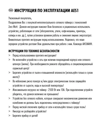 Pentru acest aparat acordam un termen de garantie de 3 ani. Pentru pagube cauzate de nerespectarea instructiunilor de utilizare nu se acorda garantia. Ne rezervam dreptul la modificari tehnice. Nu preluam raspunderea pentru erori de tipar. 05/2009 RUS Инструкция по эксплуатации AES1 Уважаемый покупатель, Поздравляем Вас с покупкой интеллектуального сетевого таймера c технологией Zero Watt. Данная инструкция поможет Вам безопасно и рационально использовать устройства, работающие от сети (обогреватели, утюги, кофе-машины, принтеры, копиры и мн. др.), путем установки времени работы и снижения лишних энергозатрат. Внимательно прочтите инструкции перед использованием. Надеемся, что наше зарядное устройство доставит Вам удовольствие при работе с ним. Команда АНСМАНН. ИСТРУКЦИИ ПО ТЕХНИКЕ БЕЗОПАСНОСТИ > Перед использованием прочтите инструкцию! > Не включайте устройство в сеть при наличии повреждений корпуса или сетевого штекера (вилки). При необходимости ремонта обращайтесь в специализированный сервисный центр! > Берегите устройство от пыли и повышенной влажности (используйте только в сухом > Во избежание риска пожара и/или удара электрическим током защищайте устройство от сырости, воды и высокой температуры! > Максимальная нагрузка на таймер - 2500 Вт или 10A. При подключении устройств убедитесь, что данная величина не превышена! > Устройства без сетевого кабеля, которые совершают механические движения или колебания не должны быть подключены непосредственно к таймеру! > Перед чисткой отключите прибор от сети и используйте только сухую ткань! > Никогда не разбирайте устройство! > Берегите прибор от детей! > Несоблюдение инструкций безопасности может повлечь за собой поломку таймера, а также нанести вред здоровью! > Подключайте таймер только в надежно зафиксированную и работающую розетку! ОБЗОР ФУНКЦИЙ > Интеллектуальный сетевой таймер с технологией ZeroWatt > Исключает потребление электроэнергии в режиме ожидания > Безопасное автоматическое отключение сетевого питания > Задаваемое пользователем время работы: 15, 30 минут, 1, 2, 4, 8 часов. > Простое управление с помощью одной кнопки > Светодиод-индикатор оставшегося времени > Мощность: 2500 Вт (10A) ЭКСПЛУАТАЦИЯ Подключите сетевой таймер в настенную розетку. Таймер готов к использованию, но время его работы не установлено. Подключите нагрузку (прибор). Чтобы включить таймер на нужное время, нажмите и удерживайте нажатой кнопку „СТАРТ - СТОП“ в течении 2 секунд для включения подачи электроэнергии на 15 минут. Каждое дополнительное нажатие увеличивает время работы вдвое, вплоть до 8 часов. Временные отрезки, задаваемые таймеру: 15 минут, 30 минут, 1 час, 2 часа, 4 часа или 8 часов. Оставшееся время работы обозначается соответствующим светодиодом. Время может быть изменено в ходе работы таймера нажатием кнопки „СТАРТ-СТОП“ в любой момент. Если вы хотите выключить подключенный прибор, выберите „8h“ и нажмите кнопку „СТАРТ-СТОП“ кнопку еще раз. В этом случае, или когда установленное время работы таймера истекает, светодиод „15MIN“ мигает в течении 10 секунд. После этого таймер автоматически отключается от сети и не потребляет электроэнергию. Находясь в розетке (с электрической нагрузкой или без), сетевой таймер не представляет опасности. ЭКОЛОГИЧЕСКИЕ МЕРЫ ПРЕДОСТОРОЖНОСТИ Не утилизируйте сетевой таймер как обычный бытовой мусор. Пожалуйста, верните его компании-продавцу или в ближайший центр утилизации. Пожалуйста, ут