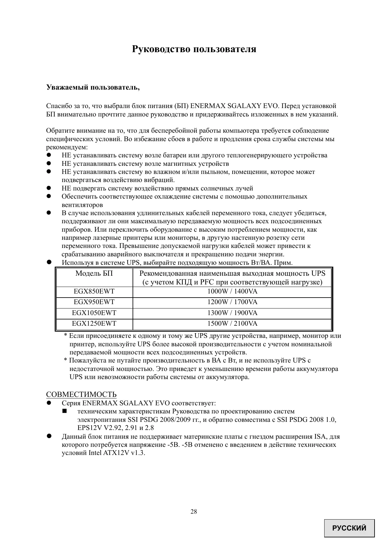 Скачайте инструкцию для вашего Блок питания для компьютера в формате PDF бесплатно! Найдите своё руководство SGALAXY EVO - ENERMAX и возьмите своё электронное устройство обратно в руки. На этой странице опубликованы все документы, необходимые для использования вашего устройства. SGALAXY EVO бренда ENERMAX.