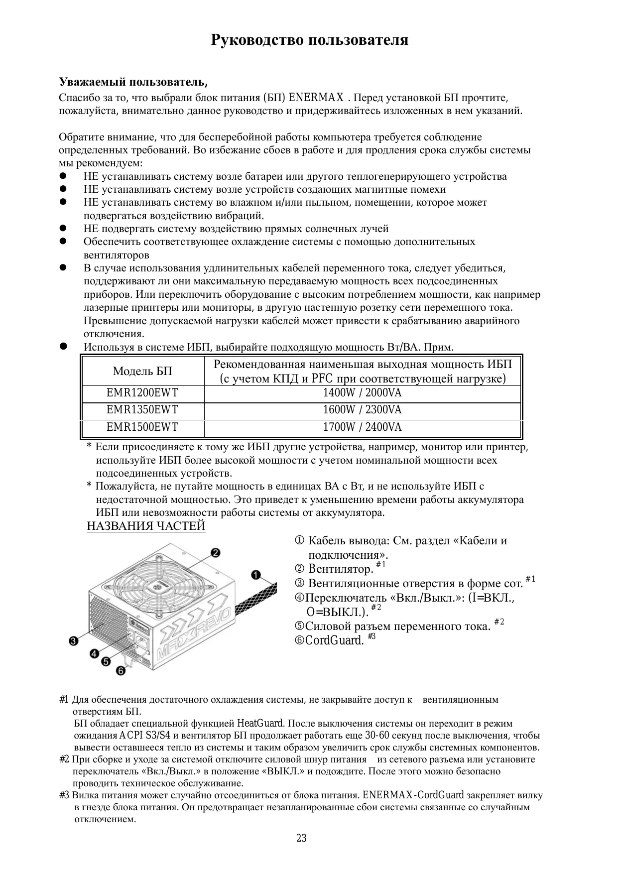 #1 Для обеспечения достаточного охлаждения системы, не закрывайте доступ к вентиляционным отверстиям БП. БП обладает специальной функцией HeatGuard. После выключения системы он переходит в режим ожидания ACPI S3/S4 и вентилятор БП продолжает работать еще 30-60 секунд после выключения, чтобы вывести оставшееся тепло из системы и таким образом увеличить срок службы системных компонентов. #2 При сборке и уходе за системой отключите силовой шнур питания из сетевого разъема или установите переключатель «Вкл./Выкл.» в положение «ВЫКЛ.» и подождите. После этого можно безопасно проводить техническое обслуживание. #3 Вилка питания может случайно отсоединиться от блока питания. ENERMAX-CordGuard закрепляет вилку в гнезде блока питания. Он предотвращает незапланированные сбои системы связанные со случайным отключением. 23