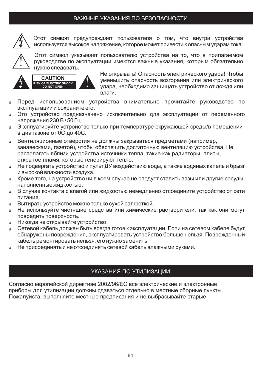 занавесками, газетой), чтобы обеспечить достаточную вентиляцию устройства. Не располагать вблизи устройства источники тепла, такие как радиаторы, плиты, открытое пламя, которые генерируют тепло. Не подвергать устройство и пульт ДУ воздействию воды, а также водяных капель и брызг и высокой влажности воздуха. Кроме того, на устройство ни в коем случае не следует ставить вазы или другие сосуды, наполненные жидкостью. В случае контакта с влагой или жидкостью немедленно отсоедините устройство от сети Вытирать устройство можно только сухой салфеткой. Не используйте чистящие средства или химические растворители, так как они могут повредить поверхность. Никогда не открывайте устройство Сетевой кабель должен быть всегда готов к эксплуатации. Если на сетевом кабеле будут обнаружены повреждения, эксплуатировать устройство больше нельзя. Поврежденный кабель ремонтировать нельзя, его нужно заменить. Не присоединять и не отсоединять сетевой кабель влажными руками. УКАЗАНИЯ ПО УТИЛИЗАЦИИ Согласно европейской директиве 2002/96/EC все электрические и электронные приборы для утилизации должны сдаваться отдельно в местные сборные пункты. Пожалуйста, выполняйте местные предписания и не выбрасывайте старые
