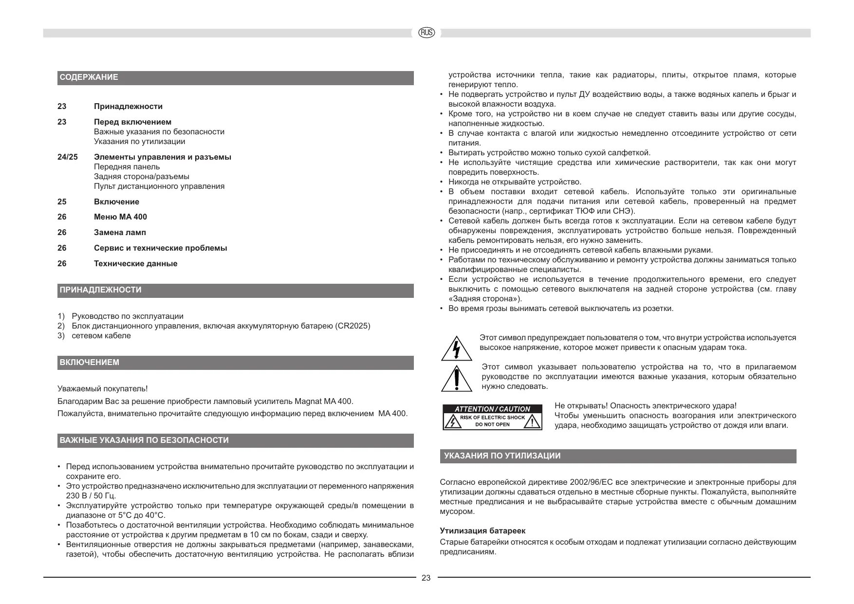 Этот символ указывает пользователю устройства на то, что в прилагаемом руководстве по эксплуатации имеются важные указания, которым обязательно нужно следовать. Уважаемый покупатель! Благодарим Вас за решение приобрести ламповый усилитель Magnat MA 400. Не открывать! Опасность электрического удара! Чтобы уменьшить опасность возгорания или электрического удара, необходимо защищать устройство от дождя или влаги. Пожалуйста, внимательно прочитайте следующую информацию перед включением MA 400. ВАЖНЫЕ УКАЗАНИЯ ПО БЕЗОПАСНОСТИ УКАЗАНИЯ ПО УТИЛИЗАЦИИ