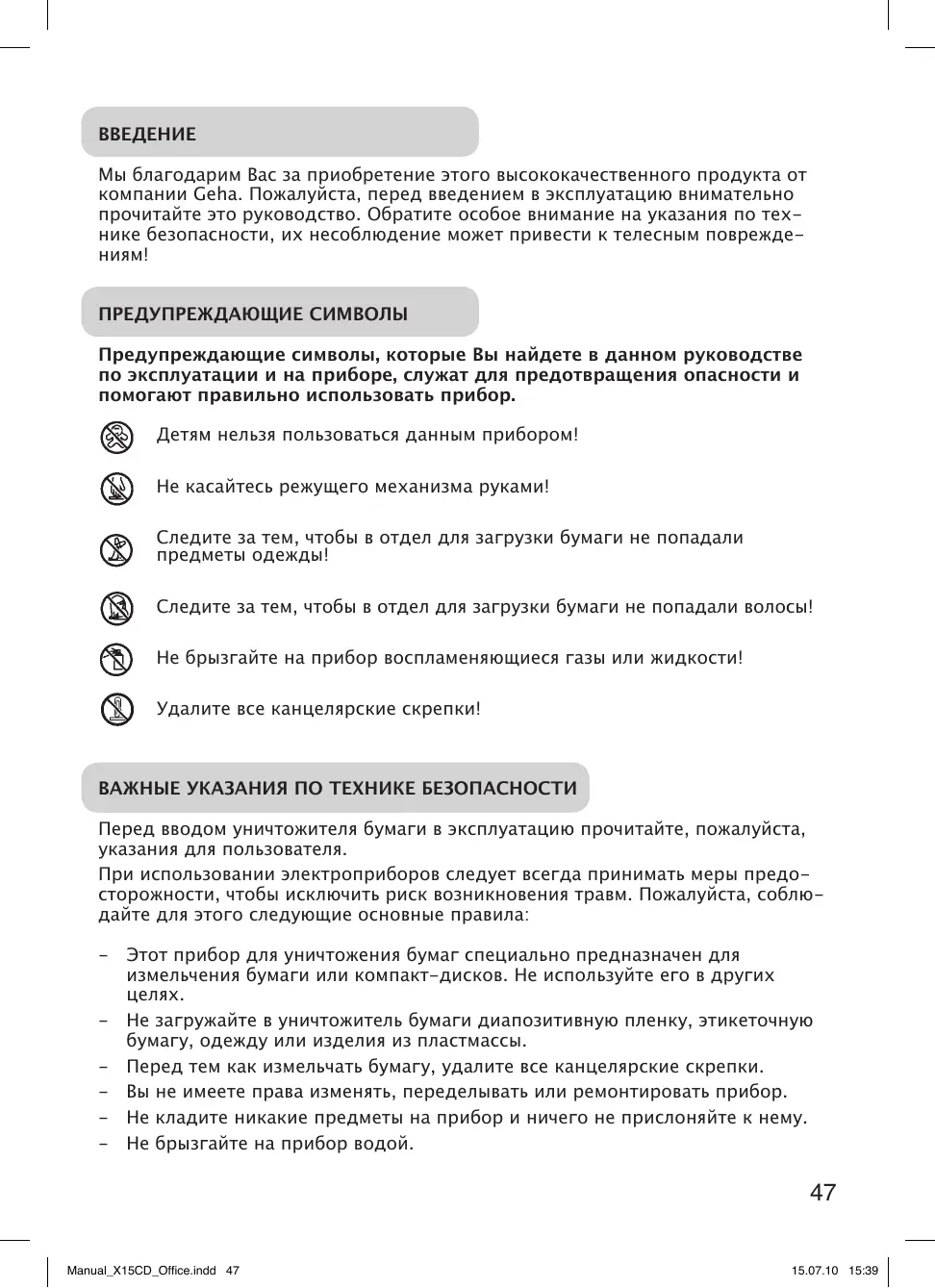 OFFICE X15 CD - уничтожитель документов GEHA - Бесплатное руководство пользователя