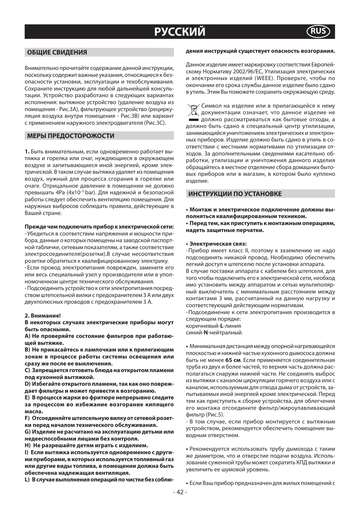 RUS дения инструкций существует опасность возгорания. ОБЩИЕ СВИДЕНИЯ Внимательно прочитайте содержание данной инструкции, поскольку содержит важные указания, относящиеся к безопасности установки, эксплуатации и техобслуживания. Сохраните инструкцию для любой дальнейшей консультации. Устройство разработано в следующих вариантах исполнения: вытяжное устройство (удаление воздуха из помещения - Рис.3A), фильтрующее устройство (рециркуляция воздуха внутри помещения - Рис.3B) или вариант с применением наружного электродвигателя (Рис.3C). МЕРЫ ПРЕДОСТОРОЖОСТИ