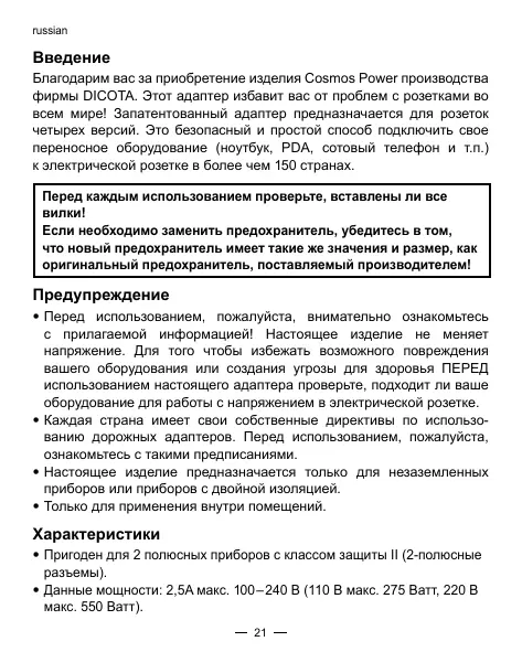 РУКОВОДСТВО ПОЛЬЗОВАТЕЛЯ COSMOS POWER DICOTA