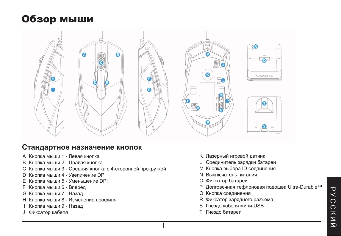 Стандартное назначение кнопок Кнопка мыши 1 - Левая кнопка Кнопка мыши 2 - Правая кнопка Кнопка мыши 3 - Средняя кнопка с 4-сторонней прокруткой Кнопка мыши 4 - Увеличение DPI Кнопка мыши 5 - Уменьшение DPI Кнопка мыши 6 - Вперед Кнопка мыши 7 - Назад Кнопка мыши 8 - Изменение профиля Кнопка мыши 9 - Назад Фиксатор кабеля