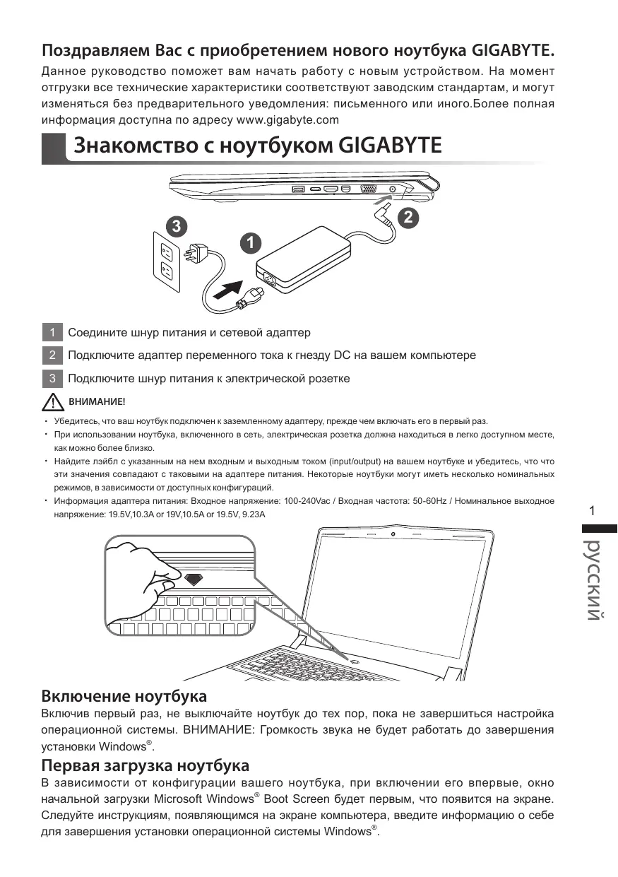 Поздравляем Вас с приобретением нового ноутбука GIGABYTE. Данное руководство поможет вам начать работу с новым устройством. На момент отгрузки все технические характеристики соответствуют заводским стандартам, и могут изменяться без предварительного уведомления: письменного или иного.Более полная информация доступна по адресу www.gigabyte.com