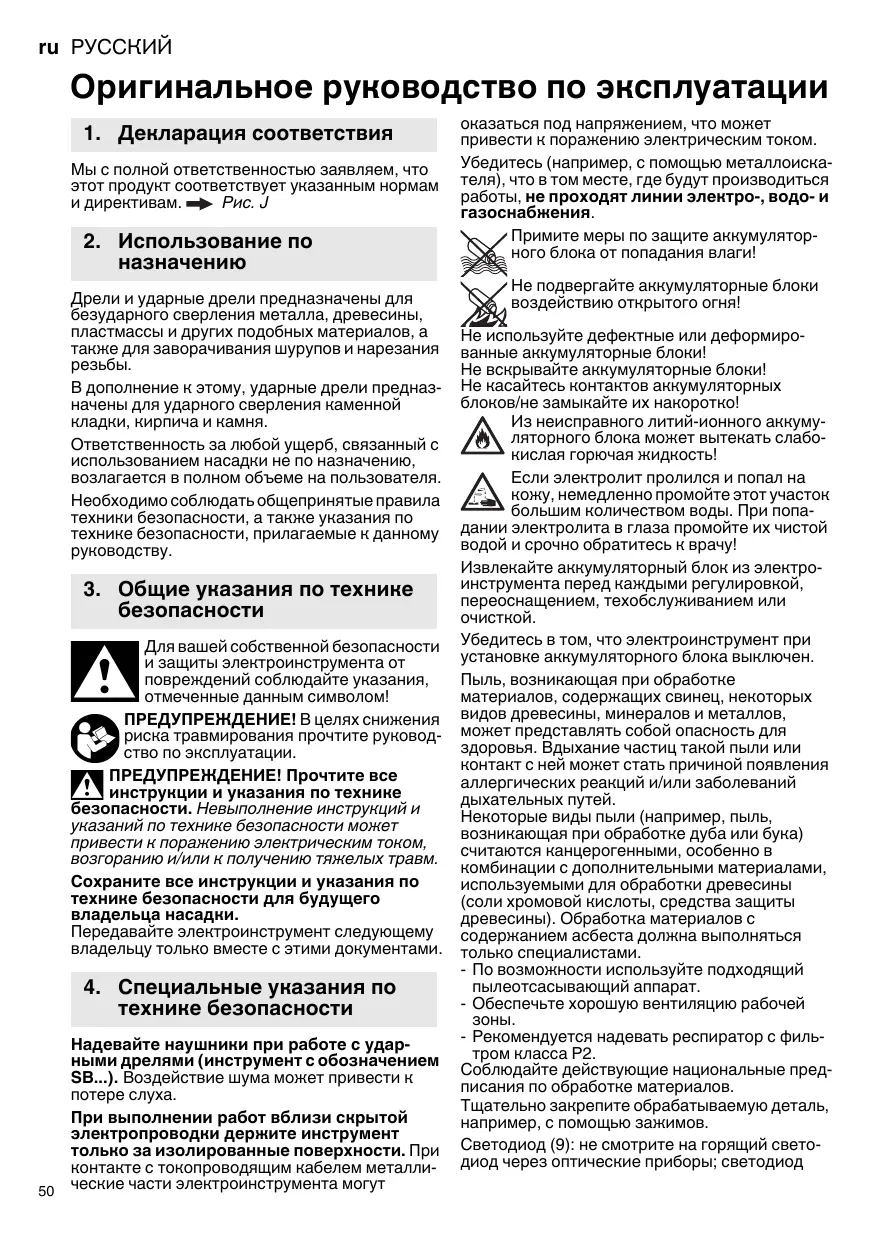 4. Специальные указания по технике безопасности Надевайте наушники при работе с ударными дрелями (инструмент с обозначением SB...). Воздействие шума может привести к потере слуха. При выполнении работ вблизи скрытой электропроводки держите инструмент только за изолированные поверхности. При контакте с токопроводящим кабелем металли50 ческие части электроинструмента могут