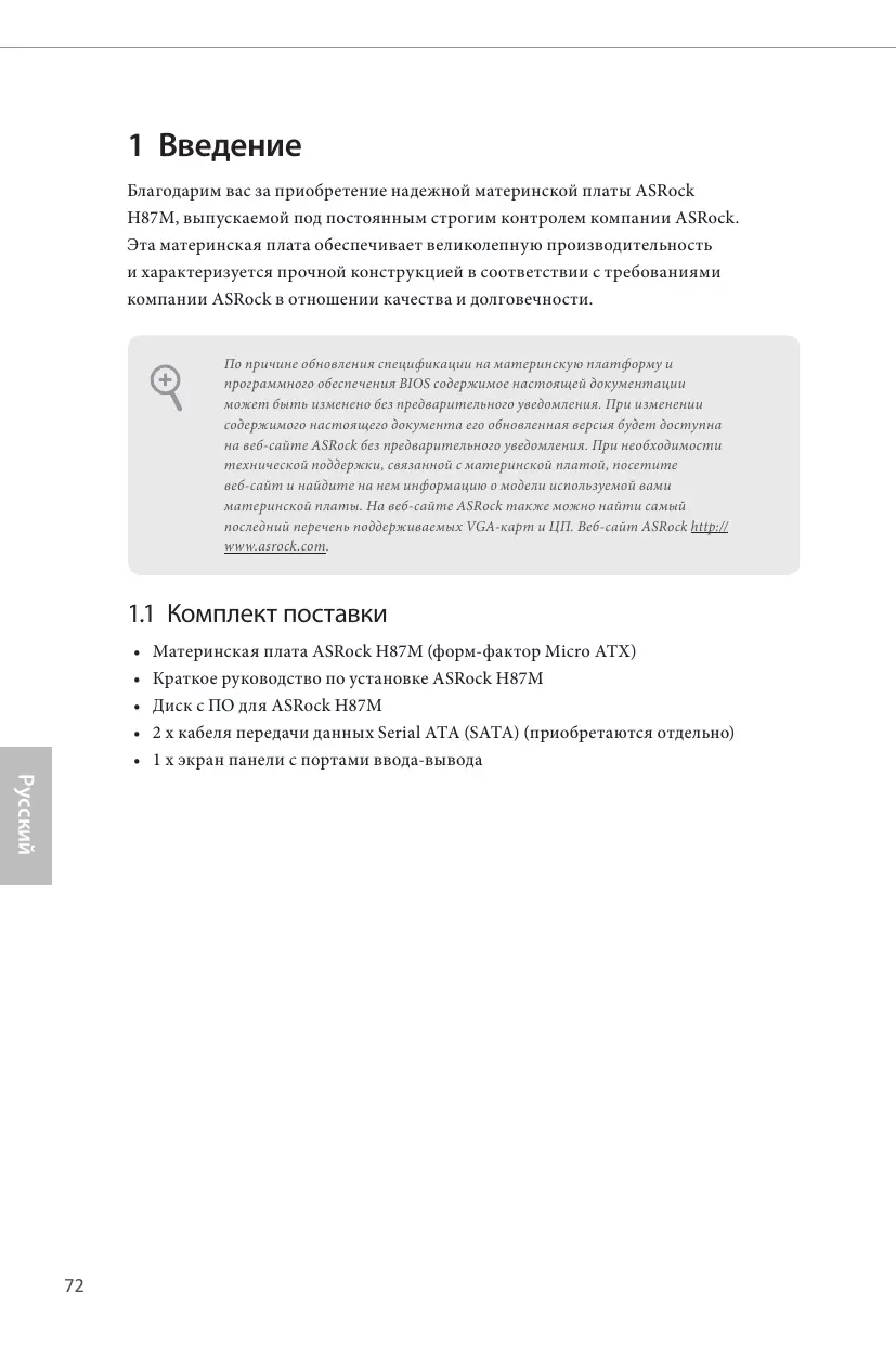1 Введение Благодарим вас за приобретение надежной материнской платы ASRock H87M, выпускаемой под постоянным строгим контролем компании ASRock. Эта материнская плата обеспечивает великолепную производительность и характеризуется прочной конструкцией в соответствии с требованиями компании ASRock в отношении качества и долговечности. По причине обновления спецификации на материнскую платформу и программного обеспечения BIOS содержимое настоящей документации может быть изменено без предварительного уведомления. При изменении содержимого настоящего документа его обновленная версия будет доступна на веб-сайте ASRock без предварительного уведомления. При необходимости технической поддержки, связанной с материнской платой, посетите веб-сайт и найдите на нем информацию о модели используемой вами материнской платы. На веб-сайте ASRock также можно найти самый последний перечень поддерживаемых VGA-карт и ЦП. Веб-сайт ASRock http:// www.asrock.com.