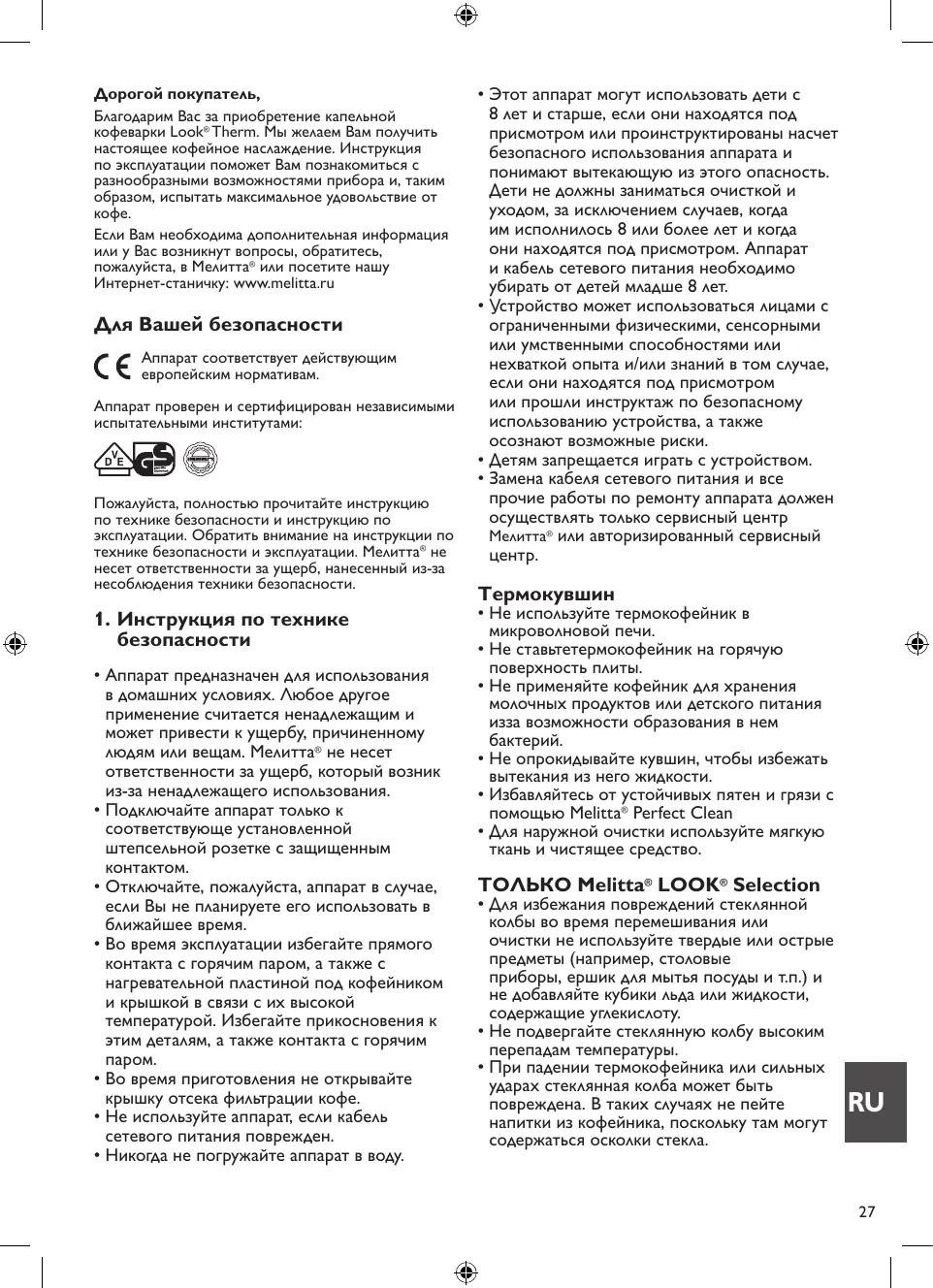 Дорогой покупатель, Благодарим Вас за приобретение капельной кофеварки Look® Therm. Мы желаем Вам получить настоящее кофейное наслаждение. Инструкция по эксплуатации поможет Вам познакомиться с разнообразными возможностями прибора и, таким образом, испытать максимальное удовольствие от кофе. Если Вам необходима дополнительная информация или у Вас возникнут вопросы, обратитесь, пожалуйста, в Мелитта® или посетите нашу Интернет-станичку: www.melitta.ru