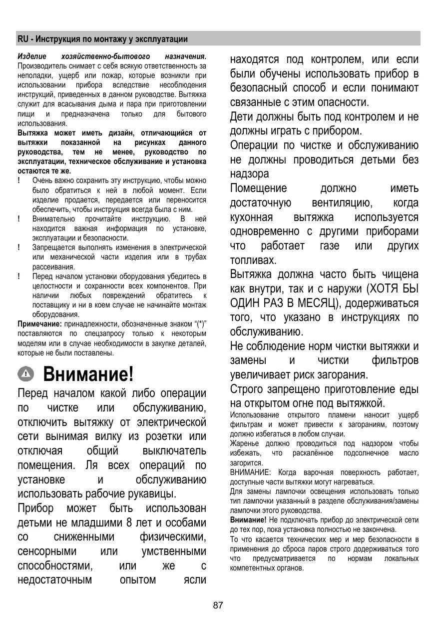 RU - Инструкция по монтажу у эксплуатации хозяйственно-бытового назначения. Производитель снимает с себя всякую ответственность за неполадки, ущерб или пожар, которые возникли при использовании прибора вследствие несоблюдения инструкций, приведенных в данном руководстве. Вытяжка служит для всасывания дыма и пара при приготовлении пищи и предназначена только для бытового использования. Вытяжка может иметь дизайн, отличающийся от