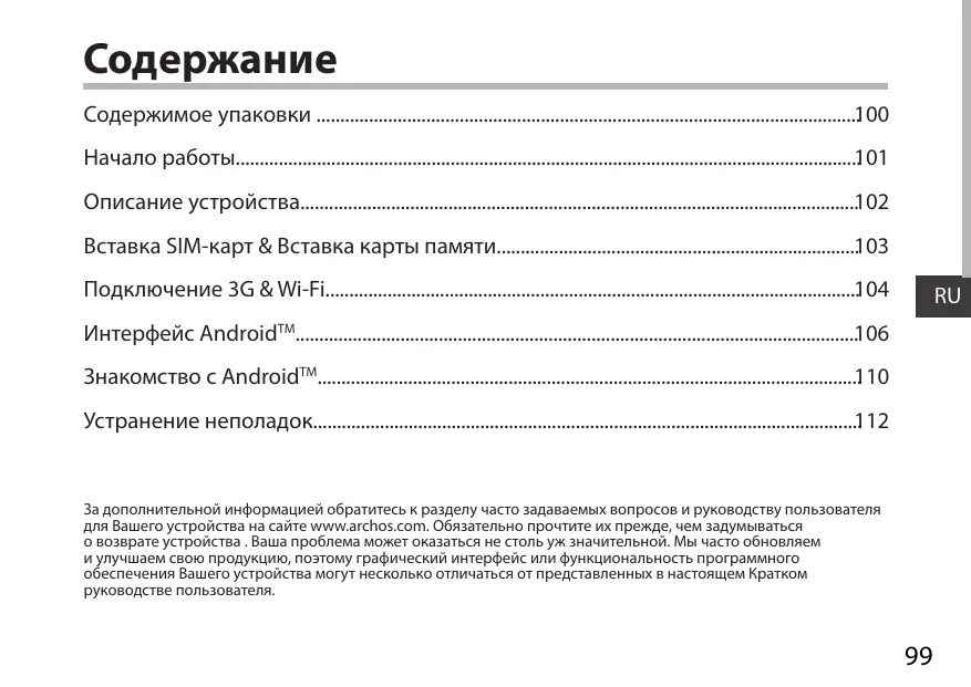 Интерфейс AndroidTM......................................................................................................................106 Знакомство с AndroidTM..................................................................................................................110 Устранение неполадок...................................................................................................................112 За дополнительной информацией обратитесь к разделу часто задаваемых вопросов и руководству пользователя для Вашего устройства на сайте www.archos.com. Обязательно прочтите их прежде, чем задумываться о возврате устройства . Ваша проблема может оказаться не столь уж значительной. Мы часто обновляем и улучшаем свою продукцию, поэтому графический интерфейс или функциональность программного обеспечения Вашего устройства могут несколько отличаться от представленных в настоящем Кратком руководстве пользователя.