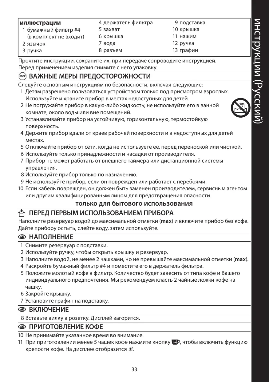 27 La piastra manterrà il caffè in caldo per due ore. 28 In questo intervallo di tempo, il simbolo X sul display lampeggerà. 4 Abra un filtro de papel del nº4 y colóquelo en el soporte del filtro. 5 Ponga café molido en el filtro. La cantidad variará en función del tipo de café y los gustos individuales, pero recomendamos 2 cucharadas pequeñas por cada vaso de agua. 6 Cierre la tapa. 7 Vuelva a colocar la jarra en la placa.