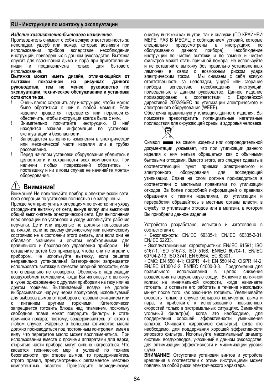 RU - Инструкция по монтажу у эксплуатации очистку вытяжки как внутри, так и снаружи (ПО КРАЙНЕЙ МЕРЕ, РАЗ В МЕСЯЦ с соблюдением условий, которые предусмотрены инструкциях обслуживанию