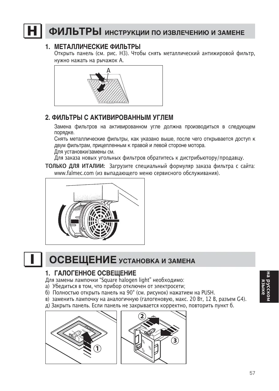 á‡ÏÂ̇ ÙËθÚÓ‚ ̇ ‡ÍÚË‚ËÓ‚‡ÌÌÓÏ Û„Î ‰ÓÎÊ̇ ÔÓËÁ‚Ó‰ËÚ¸Òfl ‚ ÒÎÂ‰Û˛˘ÂÏ ÔÓfl‰ÍÂ. ëÌflÚ¸ ÏÂÚ‡Î΢ÂÒÍË ÙËθÚ˚, Í‡Í Û͇Á‡ÌÓ ‚˚¯Â, ÔÓÒΠ˜Â„Ó ÓÚÍ˚‚‡ÂÚÒfl ‰ÓÒÚÛÔ Í ‰‚ÛÏ ÙËθڇÏ, ÔˈÂÔÎÂÌÌ˚Ï Í Ô‡‚ÓÈ Ë Î‚ÓÈ ÒÚÓÓÌ ÏÓÚÓ‡. ÑÎfl ÛÒÚ‡ÌÓ‚ÍË/Á‡ÏÂÌ˚ ÒÏ. Для заказа новых угольных фильтров обратитесь к дистрибьютору/продавцу. ТОЛЬКО ДЛЯ ИТАЛИИ: Загрузите специальный формуляр заказа фильтра с сайта: www.falmec.com (из выпадающего меню сервисного обслуживания).