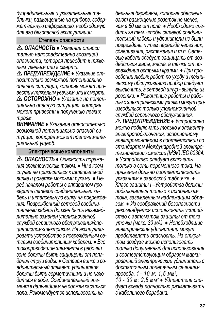 Prima di utilizzare l'apparecchio per la prima volta, leggere queste avvertenze di sicurezza e le istruzioni per l'uso originali, agire corrispondentemente e conservare entrambi i libretti per un uso futuro o per un successivo proprietario.● Osservare sempre sia le indicazioni riportate nelle istruzioni, sia le norme vigenti in materia di sicurezza/antinfortunistica. ● Le targhette di avvertimento poste sull'apparecchio forniscono importanti indicazioni in materia di sicurezza. Niveles de peligro PELIGRO ● Aviso sobre un riesgo de peligro inmediato que puede provocar lesiones corporales graves o la muerte. ADVERTENCIA ● Aviso sobre una situación propablemente peligrosa que puede provocar lesiones corporales graves o la muerte. PRECAUCIÓN ● Indicación sobre una situación que puede ser peligrosa, que puede acarrear lesiones leves. CUIDADO ● Aviso sobre una situación probablemente peligrosa que puede provocar daños materiales. Componentes eléctricos PELIGRO ● Riesgo de descarga eléctrica. ● No tocar nunca la clavija ni el enchufe con manos húmedas. ● Comprobar si está dañado el cable de alimentación con el conector de red antes de cada servicio. Si el cable de alimentación está dañado solicitar al servicio de postventa/electricista autorizado que lo cambie inmediatamente. No operar el equipo con un cable de alimentación da- FFP 2 ou similar, que se adapte às condições de limpeza.