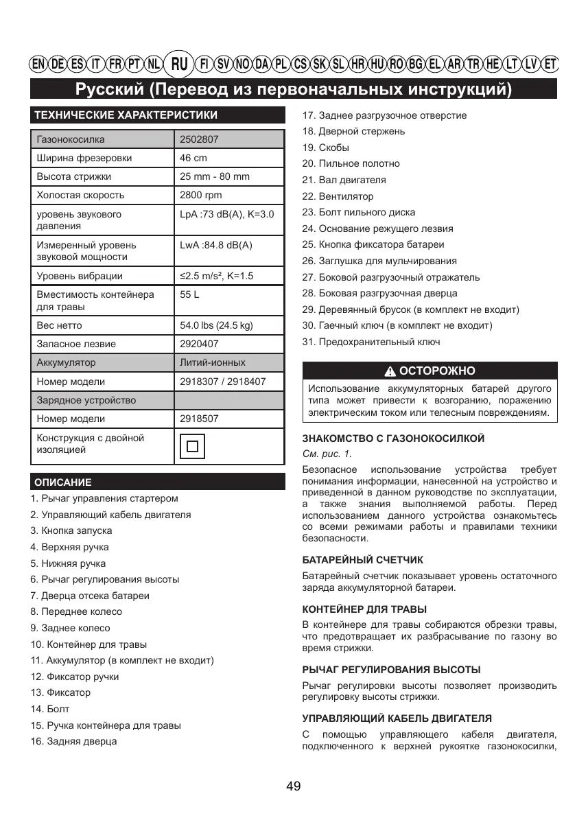 РУКОВОДСТВО ПОЛЬЗОВАТЕЛЯ GD60LM46HP - GD60LM46SPK4 - GD60LM51SPK4 GREENWORKS