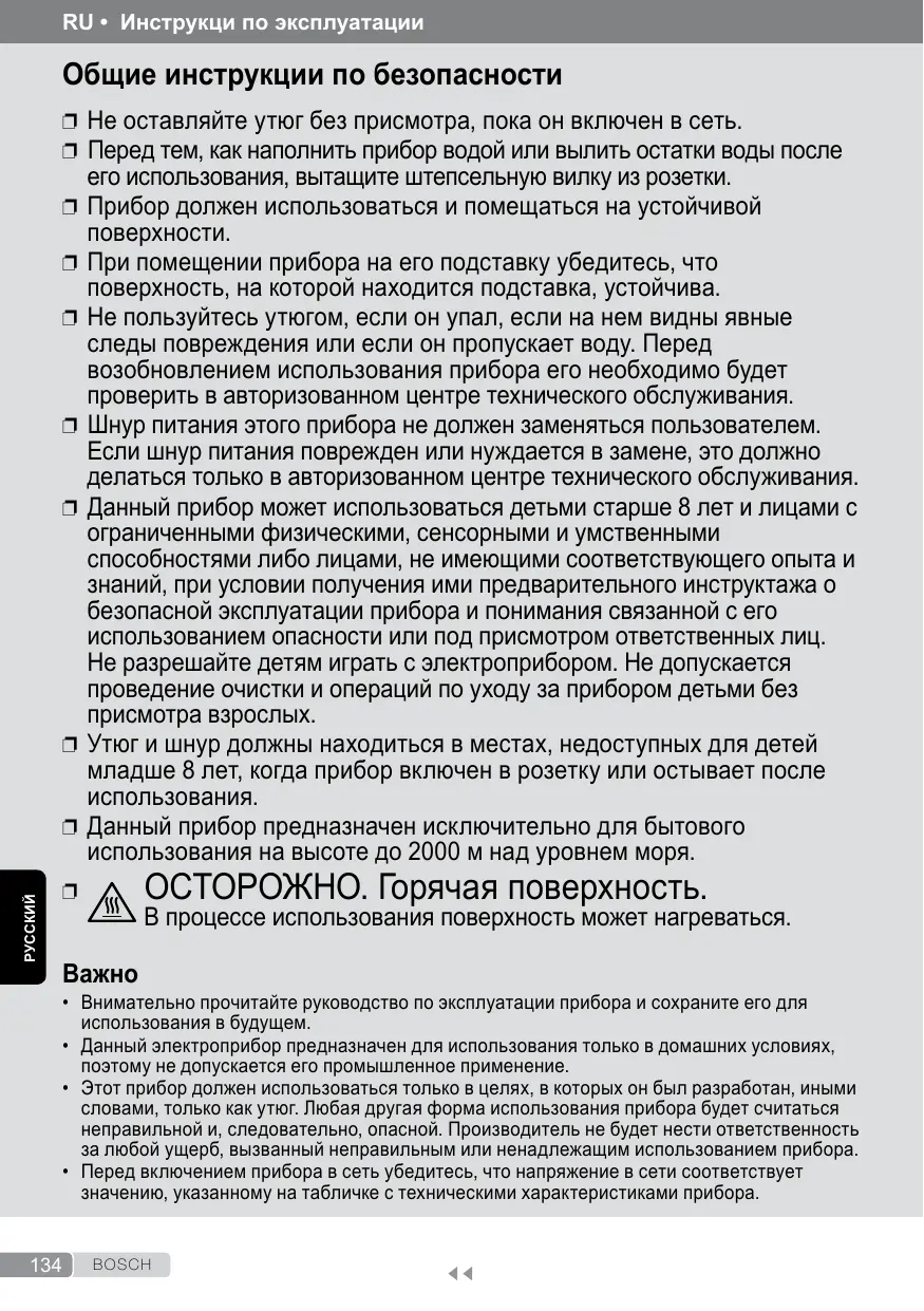 • Внимательно прочитайте руководство по эксплуатации прибора и сохраните его для использования в будущем. • Данный электроприбор предназначен для использования только в домашних условиях, поэтому не допускается его промышленное применение. • Этот прибор должен использоваться только в целях, в которых он был разработан, иными словами, только как утюг. Любая другая форма использования прибора будет считаться неправильной и, следовательно, опасной. Производитель не будет нести ответственность за любой ущерб, вызванный неправильным или ненадлежащим использованием прибора. • Перед включением прибора в сеть убедитесь, что напряжение в сети соответствует значению, указанному на табличке с техническими характеристиками прибора. 134