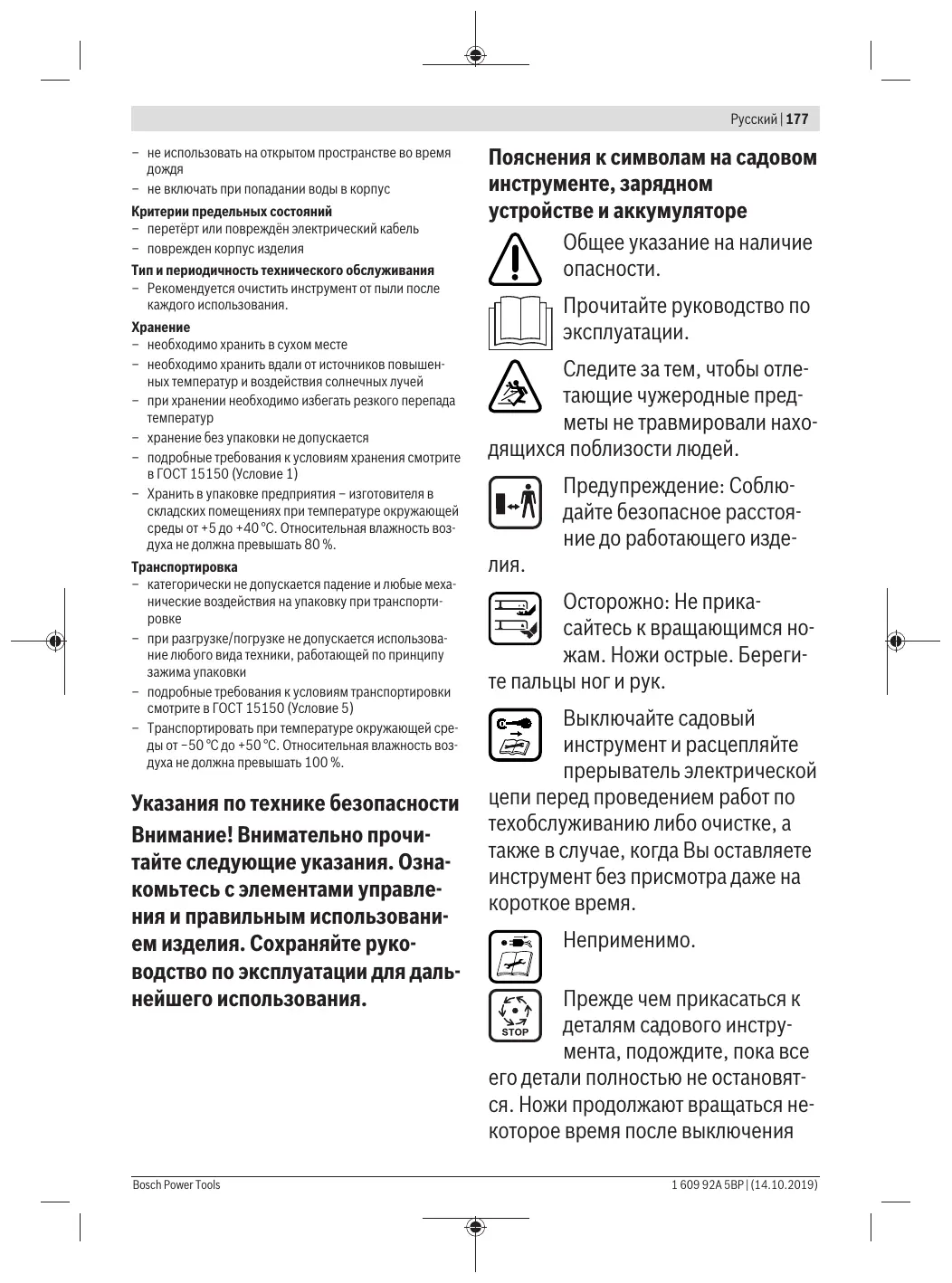 Пояснения к символам на садовом инструменте, зарядном устройстве и аккумуляторе Общее указание на наличие опасности. Прочитайте руководство по эксплуатации. Следите за тем, чтобы отлетающие чужеродные предметы не травмировали находящихся поблизости людей. Предупреждение: Соблюдайте безопасное расстояние до работающего изделия. Осторожно: Не прикасайтесь к вращающимся ножам. Ножи острые. Берегите пальцы ног и рук. Выключайте садовый инструмент и расцепляйте прерыватель электрической цепи перед проведением работ по техобслуживанию либо очистке, а также в случае, когда Вы оставляете инструмент без присмотра даже на короткое время. Неприменимо. Прежде чем прикасаться к деталям садового инструмента, подождите, пока все его детали полностью не остановятся. Ножи продолжают вращаться некоторое время после выключения 1 609 92A 5BP | (14.10.2019)