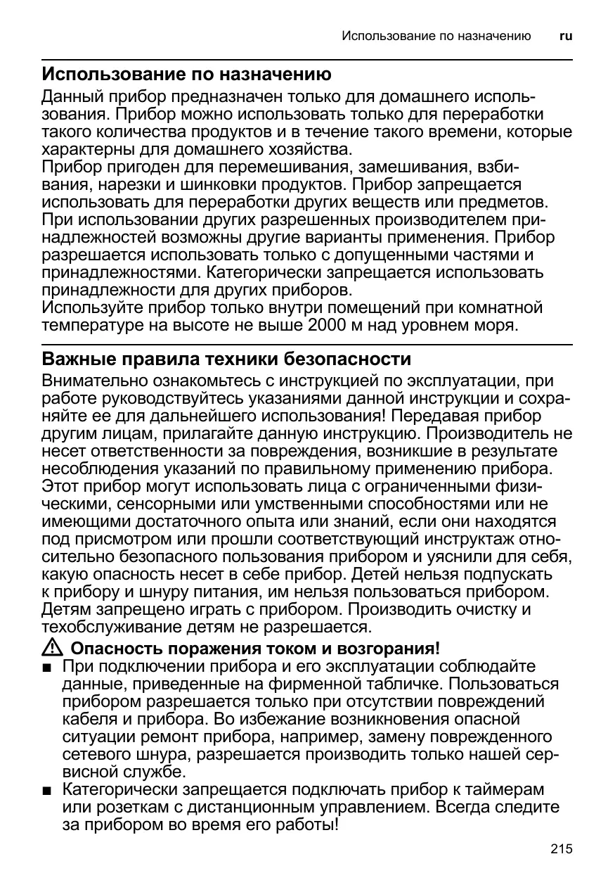 Использование по назначению Данный прибор предназначен только для домашнего использования. Прибор можно использовать только для переработки такого количества продуктов и в течение такого времени, которые характерны для домашнего хозяйства. Прибор пригоден для перемешивания, замешивания, взбивания, нарезки и шинковки продуктов. Прибор запрещается использовать для переработки других веществ или предметов. При использовании других разрешенных производителем принадлежностей возможны другие варианты применения. Прибор разрешается использовать только с допущенными частями и принадлежностями. Категорически запрещается использовать принадлежности для других приборов. Используйте прибор только внутри помещений при комнатной температуре на высоте не выше 2000 м над уровнем моря. Важные правила техники безопасности Внимательно ознакомьтесь с инструкцией по эксплуатации, при работе руководствуйтесь указаниями данной инструкции и сохраняйте ее для дальнейшего использования! Передавая прибор другим лицам, прилагайте данную инструкцию. Производитель не несет ответственности за повреждения, возникшие в результате несоблюдения указаний по правильному применению прибора. Этот прибор могут использовать лица с ограниченными физическими, сенсорными или умственными способностями или не имеющими достаточного опыта или знаний, если они находятся под присмотром или прошли соответствующий инструктаж относительно безопасного пользования прибором и уяснили для себя, какую опасность несет в себе прибор. Детей нельзя подпускать к прибору и шнуру питания, им нельзя пользоваться прибором. Детям запрещено играть с прибором. Производить очистку и техобслуживание детям не разрешается. W Опасность поражения током и возгорания! ■ При подключении прибора и его эксплуатации соблюдайте данные, приведенные на фирменной табличке. Пользоваться прибором разрешается только при отсутствии повреждений кабеля и прибора. Во избежание возникновения опасной ситуации ремонт прибора, например, замену поврежденного сетевого шнура, разрешается производить только нашей сервисной службе. ■ Категорически запрещается подключать прибор к таймерам или розеткам с дистанционным управлением. Всегда следите за прибором во время его работы!