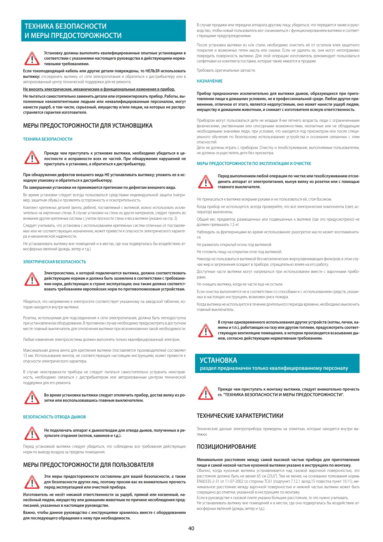 раздел предназначен только квалифицированному персоналу В случае неисправности прибора не следует пытаться самостоятельно устранить неисправность, необходимо связаться с дистрибьютером или авторизованным центром технической поддержки для его ремонта. Прежде чем приступать к монтажу вытяжки, следует внимательно прочесть гл. "ТЕХНИКА БЕЗОПАСНОСТИ И МЕРЫ ПРЕДОСТОРОЖНОСТИ". Во время установки вытяжки следует отключить прибор, достав вилку из розетки или воспользовавшись главным выключателем. ТЕХНИЧЕСКИЕ ХАРАКТЕРИСТИКИ БЕЗОПАСНОСТЬ ОТВОДА ДЫМОВ Технические данные электроприбора приведены на этикетках, которые находятся внутри вытяжки. Не подключать аппарат к дымоотводам для отвода дымов, полученных в результате сгорания (котлов, каминов и т.д.). ПОЗИЦИОНИРОВАНИЕ Перед установкой вытяжки следует убедиться, что соблюдены все требования действующих норм по выводу воздуха за пределы помещения. Минимальное расстояние между самой высокой частью прибора для приготовления пищи и самой низкой частью кухонной вытяжки указано в инструкциях по монтажу. Обычно, когда кухонная вытяжка устанавливается над газовой варочной поверхностью, это расстояние должно быть не менее 65 см (25,6"). Тем не менее, на основании толкования нормы EN60335-2-31 от 11-07-2002 со стороны TC61 (подпункт 7.12.1 засед.15 повестка пункт 10.11), минимальное расстояние между варочной поверхностью и нижней частью вытяжки может быть сокращено до отметки, указанной в инструкциях по монтажу. Если в руководстве к газовой плите указано большее расстояние, то это нужно учитывать. Не устанавливать вытяжку вне помещений и в местах, где она подвергалась бы воздействию атмосферных явлений (дождь, ветер и т.д.). МЕРЫ ПРЕДОСТОРОЖНОСТИ ДЛЯ ПОЛЬЗОВАТЕЛЯ Эти меры предосторожности составлены для вашей безопасности, а также для безопасности других лиц, поэтому просим вас их внимательно прочесть перед эксплуатацией или очисткой прибора. Изготовитель не несёт никакой ответственности за ущерб, прямой или косвенный, нанесённый людям, имуществу или домашним животным по причине несоблюдения предписаний, указанных в настоящем руководстве. Важно, чтобы данное руководство с инструкциями хранилось вместе с оборудованием для последующего обращения к нему при необходимости.