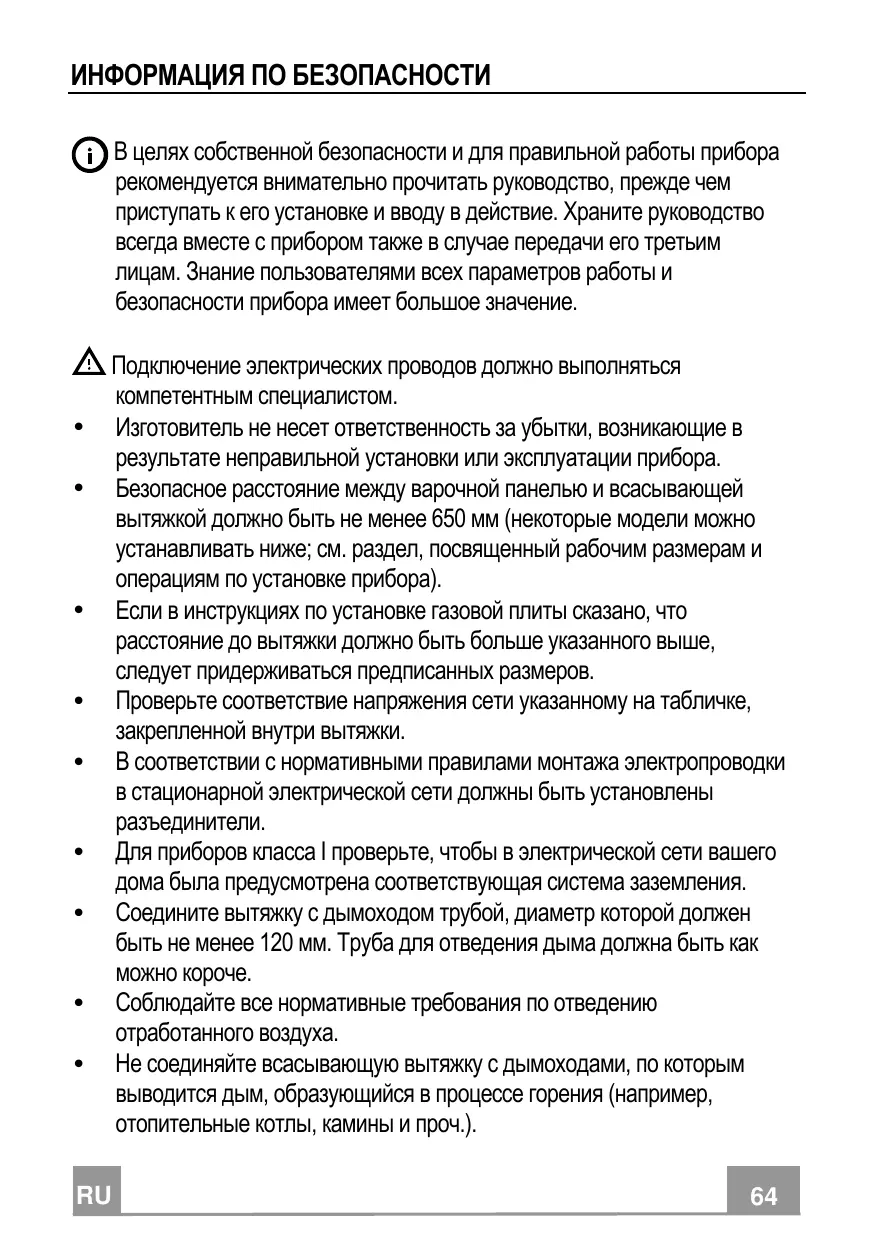 Подключение электрических проводов должно выполняться компетентным специалистом. Изготовитель не несет ответственность за убытки, возникающие в результате неправильной установки или эксплуатации прибора. Безопасное расстояние между варочной панелью и всасывающей вытяжкой должно быть не менее 650 мм (некоторые модели можно устанавливать ниже; см. раздел, посвященный рабочим размерам и операциям по установке прибора). Если в инструкциях по установке газовой плиты сказано, что расстояние до вытяжки должно быть больше указанного выше, следует придерживаться предписанных размеров. Проверьте соответствие напряжения сети указанному на табличке, закрепленной внутри вытяжки. В соответствии с нормативными правилами монтажа электропроводки в стационарной электрической сети должны быть установлены разъединители. Для приборов класса I проверьте, чтобы в электрической сети вашего дома была предусмотрена соответствующая система заземления. Соедините вытяжку с дымоходом трубой, диаметр которой должен быть не менее 120 мм. Труба для отведения дыма должна быть как можно короче. Соблюдайте все нормативные требования по отведению отработанного воздуха. Не соединяйте всасывающую вытяжку с дымоходами, по которым выводится дым, образующийся в процессе горения (например, отопительные котлы, камины и проч.).