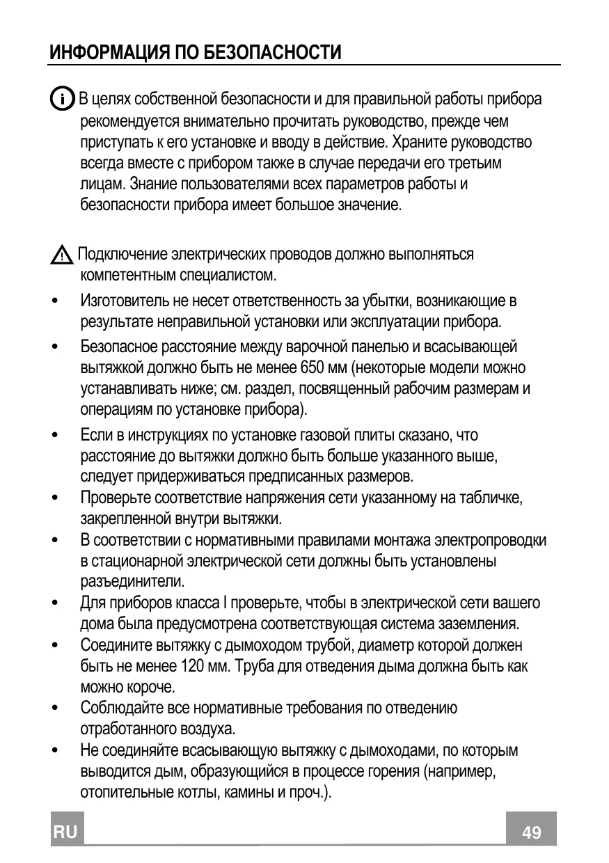 Подключение электрических проводов должно выполняться компетентным специалистом. Изготовитель не несет ответственность за убытки, возникающие в результате неправильной установки или эксплуатации прибора. Безопасное расстояние между варочной панелью и всасывающей вытяжкой должно быть не менее 650 мм (некоторые модели можно устанавливать ниже; см. раздел, посвященный рабочим размерам и операциям по установке прибора). Если в инструкциях по установке газовой плиты сказано, что расстояние до вытяжки должно быть больше указанного выше, следует придерживаться предписанных размеров. Проверьте соответствие напряжения сети указанному на табличке, закрепленной внутри вытяжки. В соответствии с нормативными правилами монтажа электропроводки в стационарной электрической сети должны быть установлены разъединители. Для приборов класса I проверьте, чтобы в электрической сети вашего дома была предусмотрена соответствующая система заземления. Соедините вытяжку с дымоходом трубой, диаметр которой должен быть не менее 120 мм. Труба для отведения дыма должна быть как можно короче. Соблюдайте все нормативные требования по отведению отработанного воздуха. Не соединяйте всасывающую вытяжку с дымоходами, по которым выводится дым, образующийся в процессе горения (например, отопительные котлы, камины и проч.).