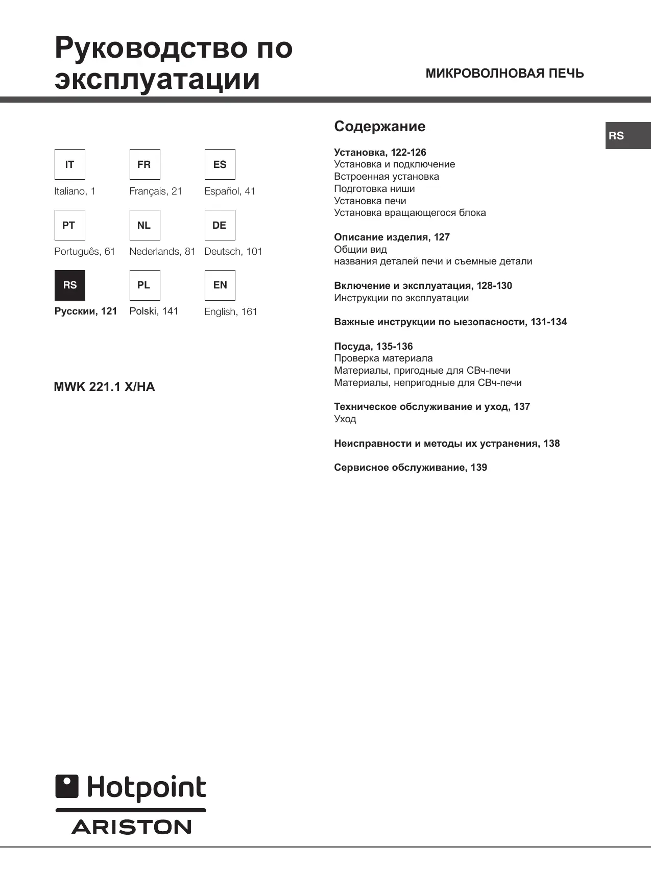 Найдите руководство к устройству бесплатно MWHA2221X HOTPOINT в формате PDF.