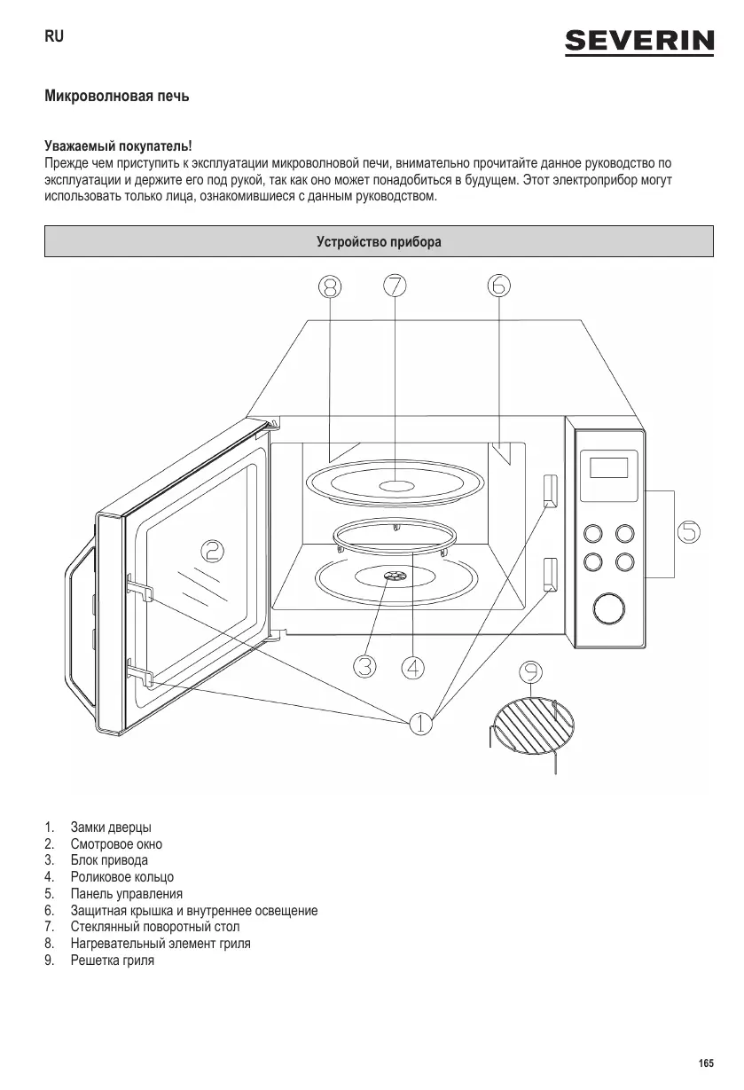 Замки дверцы Смотровое окно Блок привода Роликовое кольцо Панель управления Защитная крышка и внутреннее освещение Стеклянный поворотный стол Нагревательный элемент гриля Решетка гриля