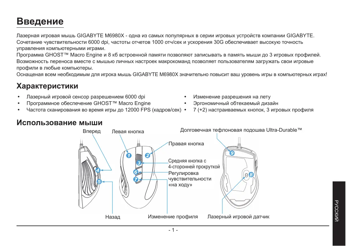 Введение Лазерная игровая мышь GIGABYTE M6980X - одна из самых популярных в серии игровых устройств компании GIGABYTE. Сочетание чувствительности 6000 dpi, частоты отчетов 1000 отч/сек и ускорения 30G обеспечивает высокую точность управления компьютерными играми. Программа GHOST™ Macro Engine и 8 кб встроенной памяти позволяют записывать в память мыши до 3 игровых профилей. Возможность переноса вместе с мышью личных настроек макрокоманд позволяет пользователям загружать свои игровые профили в любые компьютеры. Оснащеная всем необходимым для игрока мышь GIGABYTE M6980X значительно повысит ваш уровень игры в компьютерных играх!