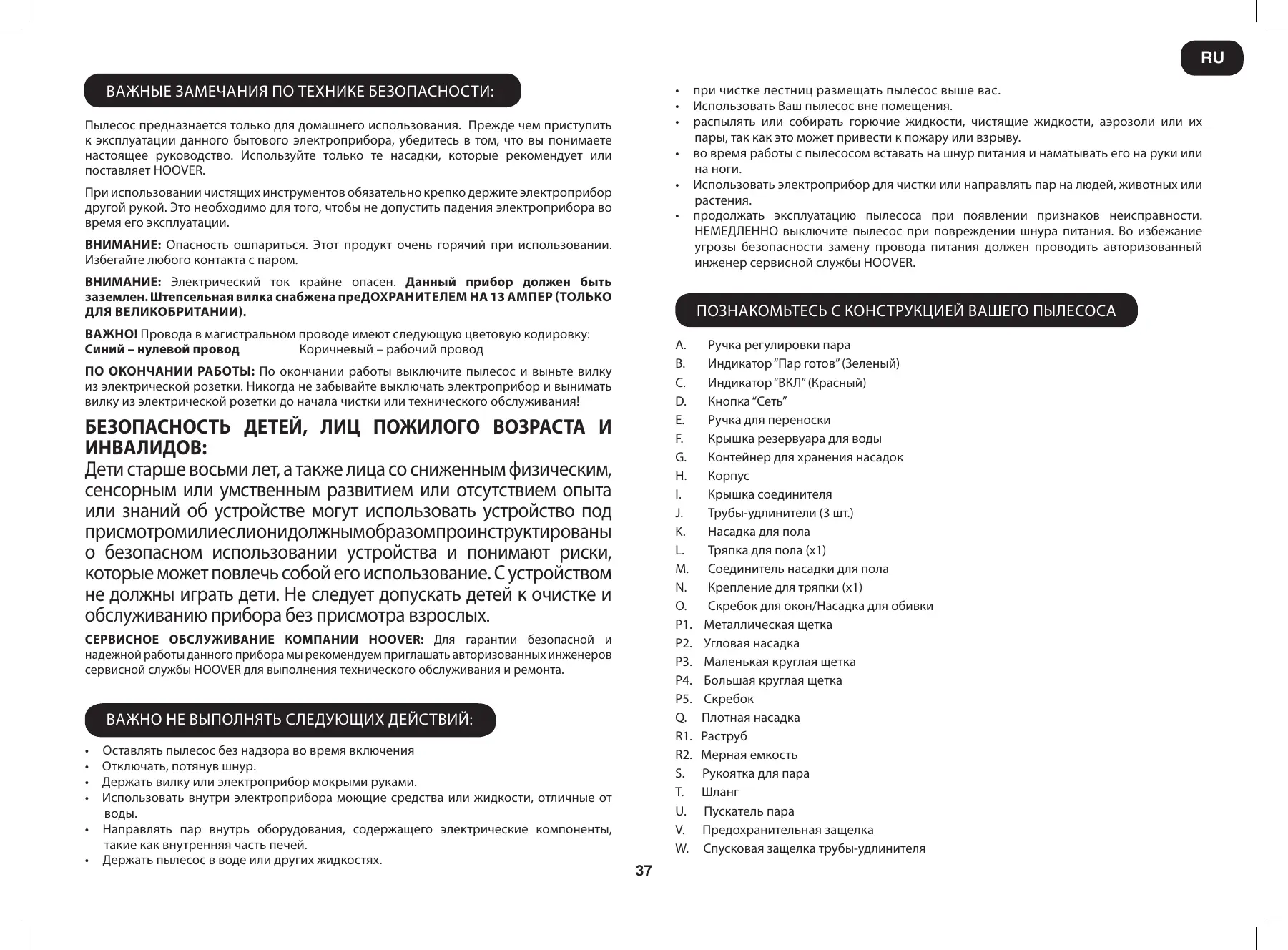 ВНИМАНИЕ: Опасность ошпариться. Этот продукт очень горячий при использовании. Избегайте любого контакта с паром. при чистке лестниц размещать пылесос выше вас. Использовать Ваш пылесос вне помещения. распылять или собирать горючие жидкости, чистящие жидкости, аэрозоли или их пары, так как это может привести к пожару или взрыву. во время работы с пылесосом вставать на шнур питания и наматывать его на руки или Использовать электроприбор для чистки или направлять пар на людей, животных или продолжать эксплуатацию пылесоса при появлении признаков неисправности. НЕМЕДЛЕННО выключите пылесос при повреждении шнура питания. Во избежание угрозы безопасности замену провода питания должен проводить авторизованный инженер сервисной службы HOOVER. ВНИМАНИЕ: Электрический ток крайне опасен. Данный прибор должен быть заземлен. Штепсельная вилка снабжена предохранителем на 13 ампер (только для Великобритании). Познакомьтесь с конструкцией Вашего пылесоса Пылесос предназнается только для домашнего использования. Прежде чем приступить к эксплуатации данного бытового электроприбора, убедитесь в том, что вы понимаете настоящее руководство. Используйте только те насадки, которые рекомендует или поставляет HOOVER.