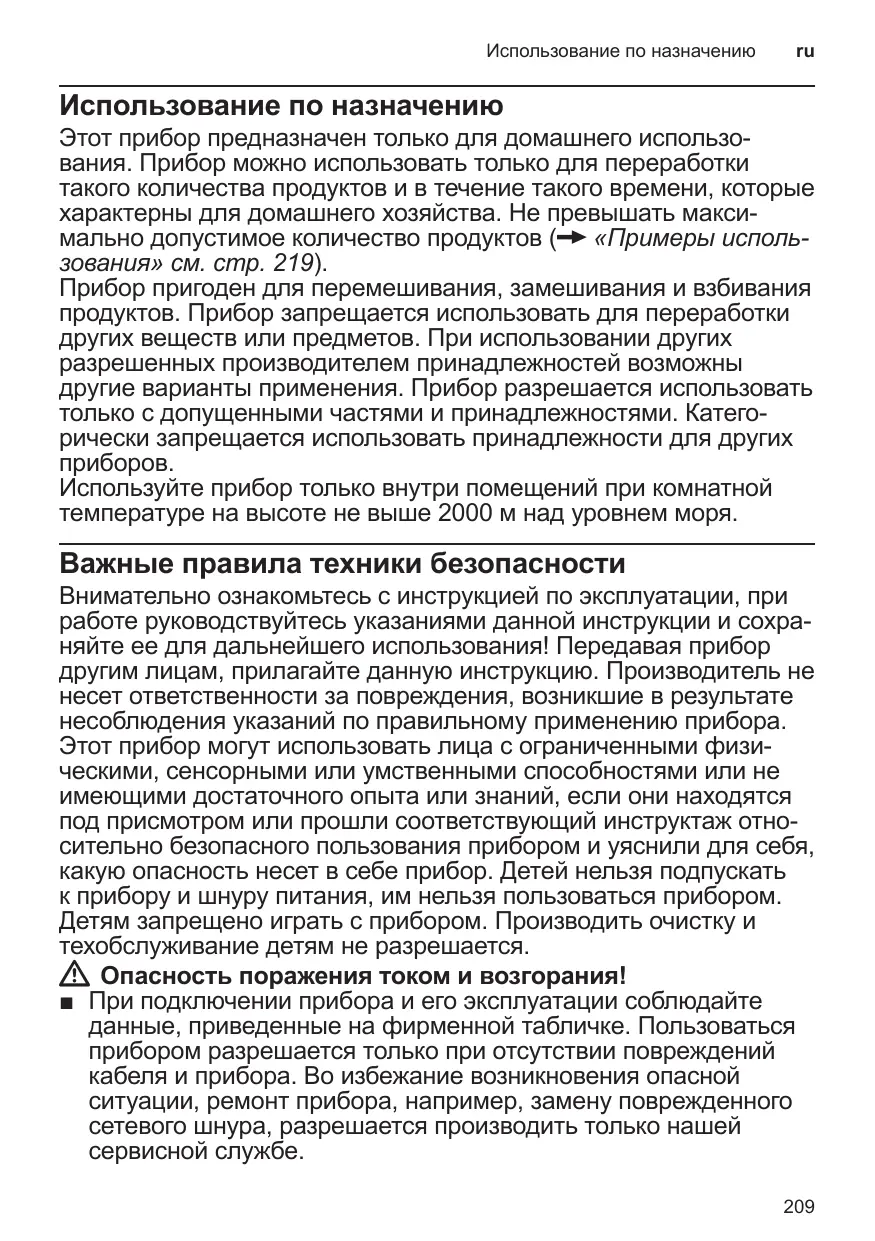 Использование по назначению Этот прибор предназначен только для домашнего использо вания. Прибор можно использовать только для переработки такого количества продуктов и в течение такого времени, которые характерны для домашнего хозяйства. Не превышать макси мально допустимое количество продуктов (X «Примеры исполь зования» см. стр. 219). Прибор пригоден для перемешивания, замешивания и взбивания продуктов. Прибор запрещается использовать для переработки других веществ или предметов. При использовании других разрешенных производителем принадлежностей возможны другие варианты применения. Прибор разрешается использовать только с допущенными частями и принадлежностями. Катего рически запрещается использовать принадлежности для других Используйте прибор только внутри помещений при комнатной температуре на высоте не выше 2000 м над уровнем моря. Важные правила техники безопасности Внимательно ознакомьтесь с инструкцией по эксплуатации, при работе руководствуйтесь указаниями данной инструкции и сохра няйте ее для дальнейшего использования! Передавая прибор другим лицам, прилагайте данную инструкцию. Производитель не несет ответственности за повреждения, возникшие в результате несоблюдения указаний по правильному применению прибора. Этот прибор могут использовать лица с ограниченными физи ческими, сенсорными или умственными способностями или не имеющими достаточного опыта или знаний, если они находятся под присмотром или прошли соответствующий инструктаж отно сительно безопасного пользования прибором и уяснили для себя, какую опасность несет в себе прибор. Детей нельзя подпускать к прибору и шнуру питания, им нельзя пользоваться прибором. Детям запрещено играть с прибором. Производить очистку и техобслуживание детям не разрешается. WW Опасность поражения током и возгорания! ■■ При подключении прибора и его эксплуатации соблюдайте данные, приведенные на фирменной табличке. Пользоваться прибором разрешается только при отсутствии повреждений кабеля и прибора. Во избежание возникновения опасной ситуации, ремонт прибора, например, замену поврежденного сетевого шнура, разрешается производить только нашей сервисной службе.