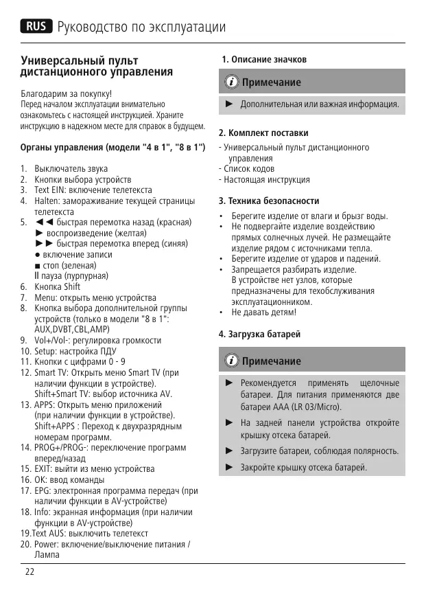 Примечание ► Дополнительная или важная информация. 2. Комплект поставки - Универсальный пульт дистанционного управления - Список кодов - Настоящая инструкция 3. Техника безопасности • Берегите изделие от влаги и брызг воды. • Не подвергайте изделие воздействию прямых солнечных лучей. Не размещайте изделие рядом с источниками тепла. • Берегите изделие от ударов и падений. • Запрещается разбирать изделие. В устройстве нет узлов, которые предназначены для техобслуживания эксплуатационником. • Не давать детям! 4. Загрузка батарей