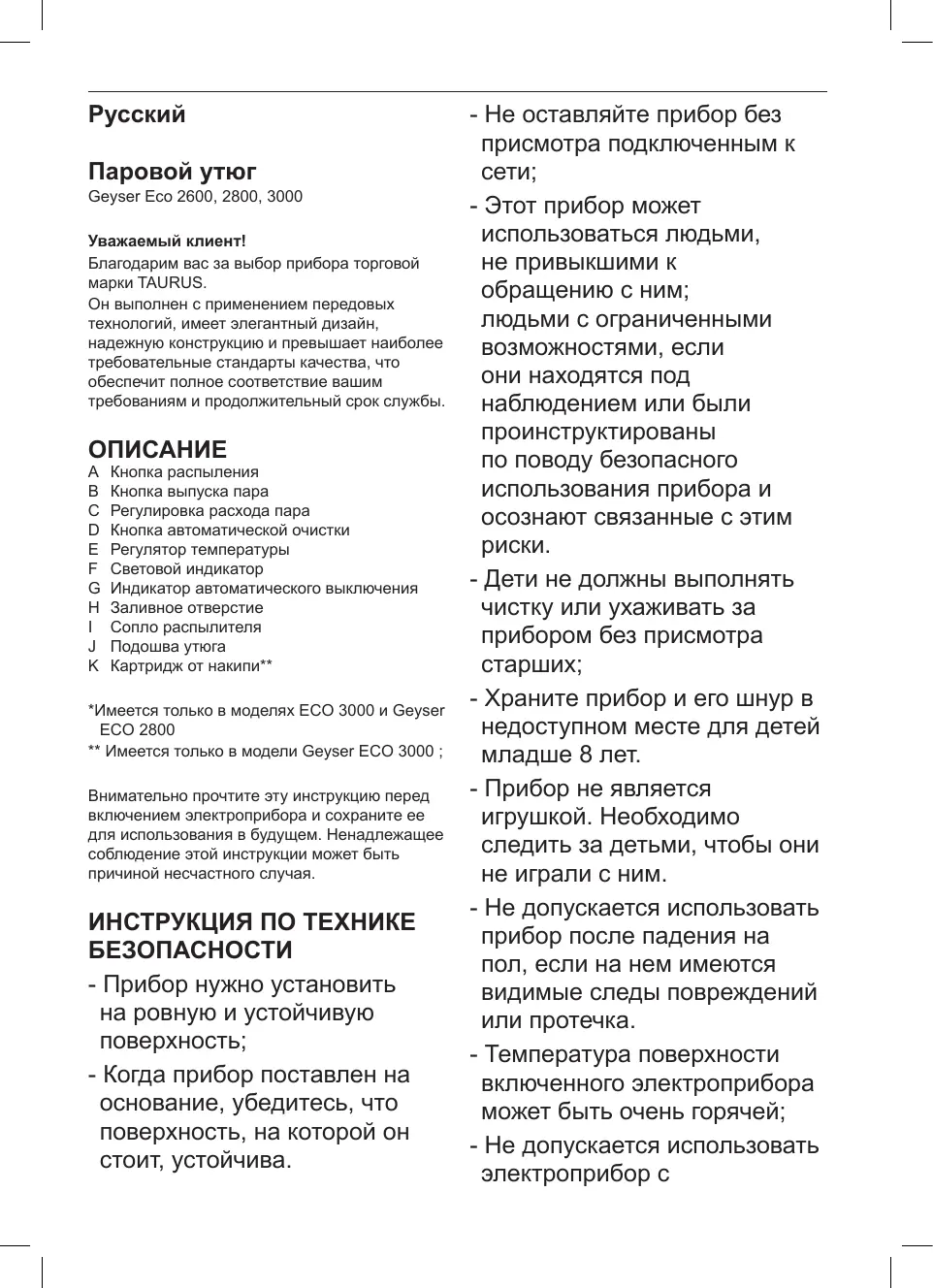 - Passer le fer à repasser de haut en bas en appuyant sur le bouton vapeur ( B ). Important : pour le coton et le lin, nous vous conseillons de mettre en contact la base du fer à repasser avec le tissu. Pour les tissus plus délicats, nous vous conseillons de l’éloigner quelques centimètres. FONCTION D’ARRÊT AUTOMATIQUE (AUTOOFF): * - Afin d’économiser de l’énergie, l’appareil passe en mode de déconnexion automatique (auto-off) s’il reste inutilisé pendant un certain laps de temps. Lorsque cela se produit, un signal sonore sera émis et le voyant lumineux de déconnexion automatique (G) clignotera pour indiquer que cette fonction est activée. - Allumage automatique en position horizontale : après environ 30 secondes sans bouger l’appareil. - Allumage automatique en position verticale : après environ 8 minutes sans bouger l’appareil. - Pour revenir en mode de fonctionnement normal, il suffit simplement de bouger l’appareil. *Disponible uniquement dans le modèle Geyser ECO 3000 et Geyser ECO 2800 APRÈS UTILISATION DE L’APPAREIL : - Choisir la position minimum (MIN) grâce au sélecteur de température. - Débrancher l’appareil de la prise secteur. - Retirer l’eau du réservoir. - Nettoyer l’appareil.