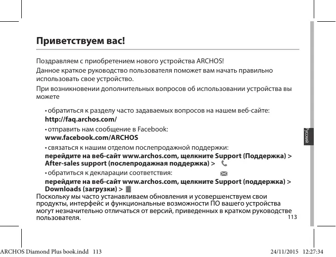• Puede consultar las preguntas más frecuentes en nuestro sitio web: entre en http://faq.archos.com/ • Puede enviarnos un mensaje en Facebook: entre en www.facebook.com/ARCHOS • Puede contactarnos a través de nuestro departamento de posventa: entre en www.archos.com, haga clic en Support (Asistencia) > After-sales support (Asistencia posventa) > • Puede consultar la declaración de conformidad: entre en www.archos.com, haga clic en Support (Asistencia) > Downloads (Descargas) > Al estar actualizando y mejorando constantemente nuestros productos, la apariencia o el software de su dispositivo pueden variar ligeramente con respecto a lo descrito en esta Guía Rápida de Inicio.