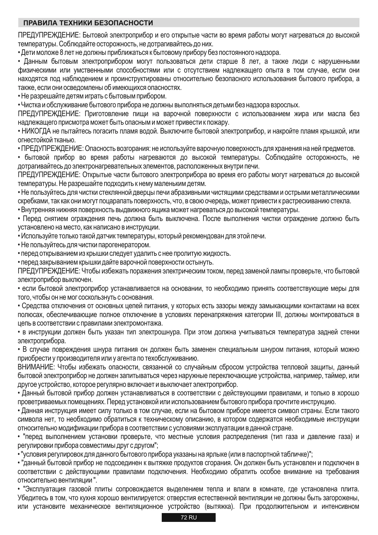 - "Эксплуатация газовой плиты сопровождается выделением тепла и влаги в комнате, где установлена плита. Убедитесь в том, что кухня хорошо вентилируется: отверстия естественной вентиляции не должны быть загорожены, или установите механическое вентиляционное устройство (вытяжка). При продолжительном и интенсивном 72 RU использовании печи может потребоваться дополнительная вентиляция, например открывание окна, или более эффективная вентиляция, например, увеличение производительности вытяжки (если она используется).