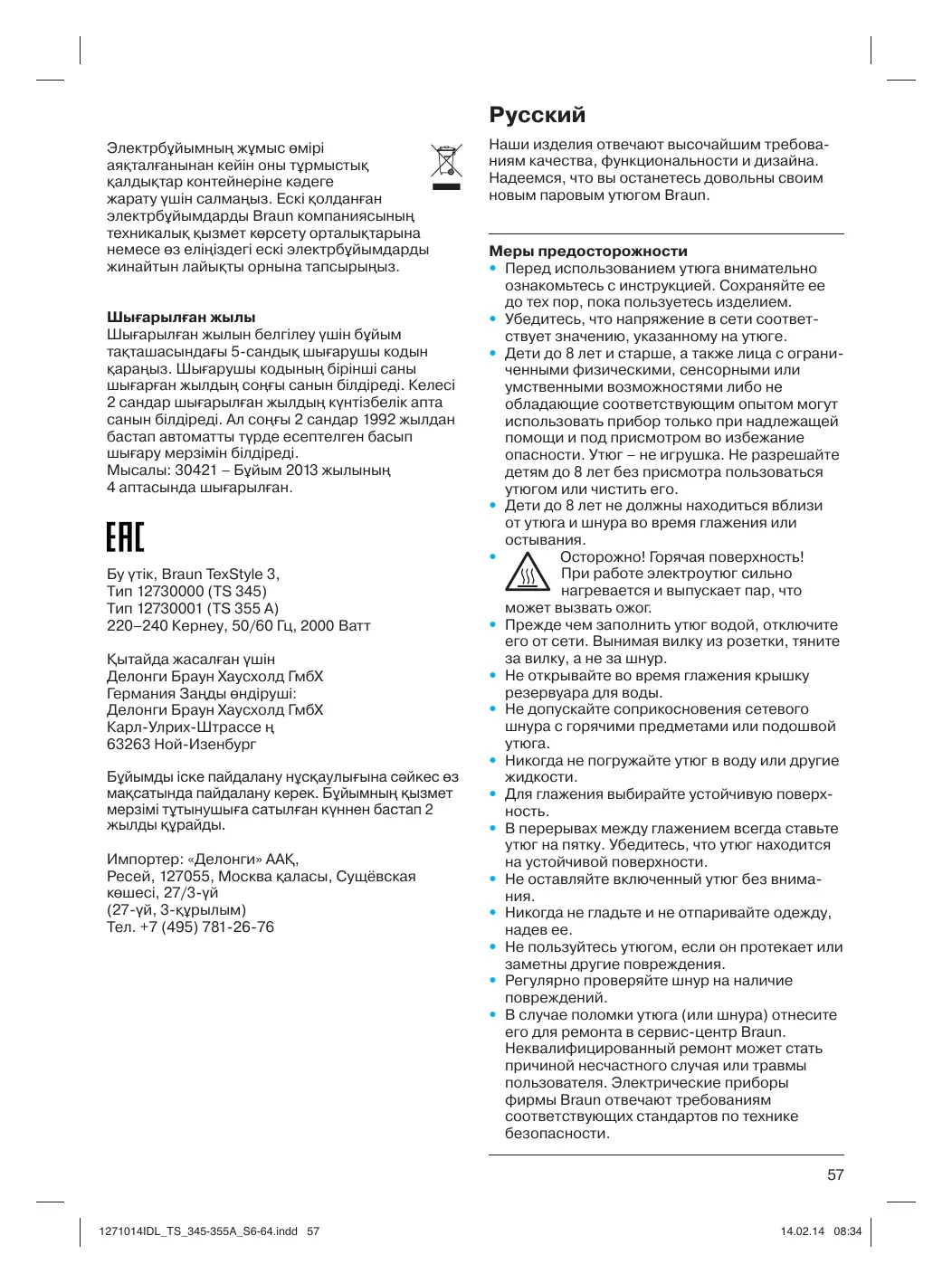 Электрб©йымны§ ж©мыс Ëмірі ая³тал¾анынан кейін оны т©рмысты³ ³алды³тар контейнеріне к¶деге жарату Æшін салма§ыз. Ескі ³олдан¾ан электрб©йымдарды Braun компаниясыны§ техникалы³ ³ызмет кËрсету орталы³тарына немесе Ëз елі§іздегі ескі электрб©йымдарды жинайтын лайы³ты орнына тапсыры§ыз. Шыарылан жылы Шы¾арыл¾ан жылын белгілеу Æшін б©йым та³ташасында¾ы 5-санды³ шы¾арушы кодын ³ара§ыз. Шы¾арушы кодыны§ бірінші саны шы¾ар¾ан жылды§ со§¾ы санын білдіреді. Келесі 2 сандар шы¾арыл¾ан жылды§ кÆнтізбелік апта санын білдіреді. Ал со§¾ы 2 сандар 1992 жылдан бастап автоматты тÆрде есептелген басып шы¾ару мерзімін білдіреді. Мысалы: 30421 – Б©йым 2013 жылыны§ 4 аптасында шы¾арыл¾ан. Бу Æтік, Braun TexStyle 3, Тип 12730000 (TS 345) Тип 12730001 (TS 355 A) 220–240 Кернеу, 50/60 Гц, 2000 Ватт Íытайда жасал¾ан Æшін Делонги Браун Хаусхолд ГмбХ Германия За§ды Ëндіруші: Делонги Браун Хаусхолд ГмбХ Карл-Улрих-Штрассе § 63263 Ной-Изенбург Бұйымды іске пайдалану нұсқаулығына сәйкес өз мақсатында пайдалану керек. Бұйымның қызмет мерзімі тұтынушыға сатылған күннен бастап 2 жылды құрайды. Импортер: «Делонги» ААÍ, Ресей, 127055, Москва ³аласы, Сущёвская кËшесі, 27/3-Æй (27-Æй, 3-³©рылым) Тел. +7 (495) 781-26-76 Наши изделия отвечают высочайшим требованиям качества, функциональности и дизайна. Надеемся, что вы останетесь довольны своим новым паровым утюгом Braun. Меры предосторожности