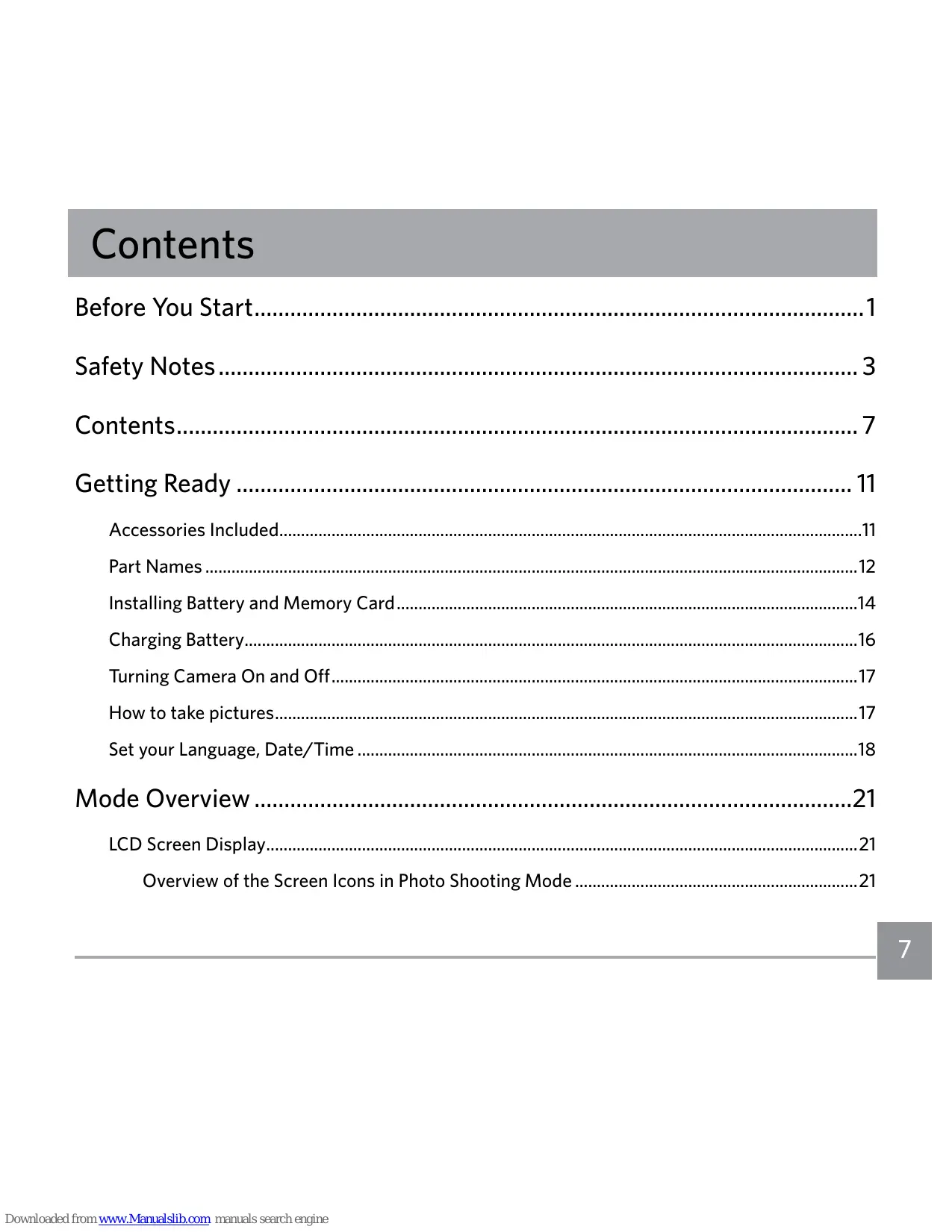 Contents Before You Start ������������������������������������������������������������������������������������������������������1 Safety Notes ����������������������������������������������������������������������������������������������������������� 3 Contents ������������������������������������������������������������������������������������������������������������������ 7 Getting Ready ������������������������������������������������������������������������������������������������������� 11 Accessories Included ��������������������������������������������������������������������������������������������������������������������������������������11 Part Names ������������������������������������������������������������������������������������������������������������������������������������������������������12 Installing Battery and Memory Card ����������������������������������������������������������������������������������������������������������14 Charging Battery ��������������������������������������������������������������������������������������������������������������������������������������������16 Turning Camera On and Off �������������������������������������������������������������������������������������������������������������������������17 How to take pictures ��������������������������������������������������������������������������������������������������������������������������������������17 Set your Language, Date/Time �������������������������������������������������������������������������������������������������������������������18