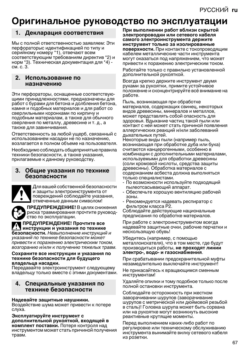 2. Utilisation conforme à la destination Equipé des accessoires correspondants, ces perceuses à percussion sont prévues pour travailler avec des forets marteau et des burins dans le béton, la pierre ou des matériaux similaires, et avec des trépans dans les tuiles, etc., ainsi que pour percer sans percussion dans le métal, le bois, etc. ou pour serrer des vis. L'utilisateur sera entièrement responsable de tous dommages résultant d'une utilisation non conforme à la destination de l'appareil. Il est impératif de respecter les consignes générales de protection contre les accidents ainsi que les consignes de sécurité ci-jointes.
