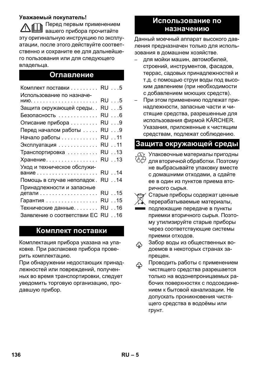. . .5 . . .6 EN 60335–1 EN 60335–2–79 EN 61000–3–2: 2006+A1: 2009+A2: 2009 EN 61000–3–3: 2008 EN 62233: 2008 Angewandtes Konformitätsbewertungsverfahren 2000/14/EG: Anhang V Schallleistungspegel dB(A) EN 60335–1 EN 60335–2–79 EN 61000–3–2: 2006+A1: 2009+A2: 2009 EN 61000–3–3: 2008 EN 62233: 2008 Applied conformity evaluation method 2000/14/EC: Appendix V Sound power level dB(A) Measured: Ce nettoyeur haute pression ne doit être utilisé que pour un usage privé: – pour le nettoyage de machines, véhicules, bâtiments, outils, façades, terrasses, outils de jardinage etc. avec un jet d'eau sous pression (et si besoin en ajoutant des détergents). – avec des accessoires, pièces de rechange et détergents homologués par KÄRCHER. Veuillez respecter les consignes livrées avec les détergents.