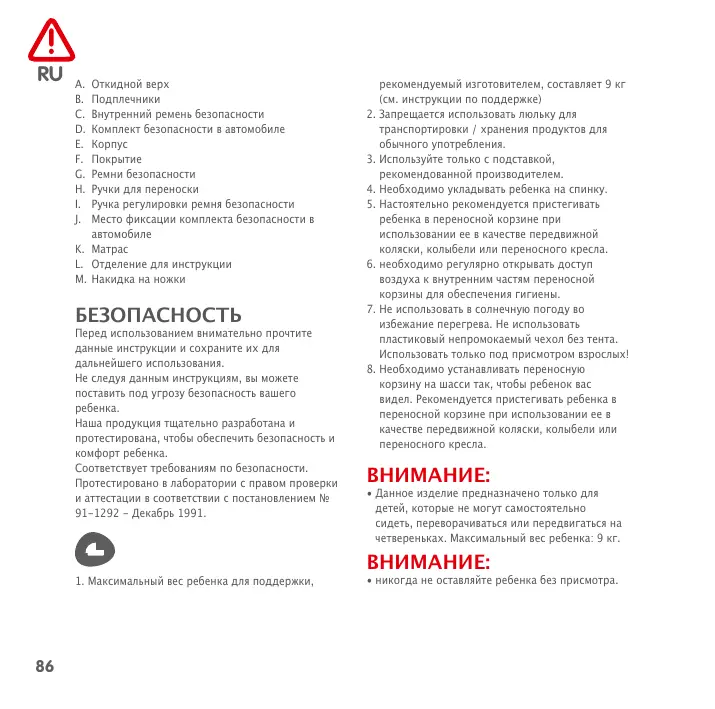 J. Место фиксации комплекта безопасности в K. Матрас L. Отделение для инструкции M. Накидка на ножки БЕЗОПАСНОСТЬ Перед использованием внимательно прочтите данные инструкции и сохраните их для дальнейшего использования. Не следуя данным инструкциям, вы можете поставить под угрозу безопасность вашего Наша продукция тщательно разработана и протестирована, чтобы обеспечить безопасность и комфорт ребенка. Соответствует требованиям по безопасности. Протестировано в лаборатории с правом проверки и аттестации в соответствии с постановлением № 91-1292 - Декабрь 1991.