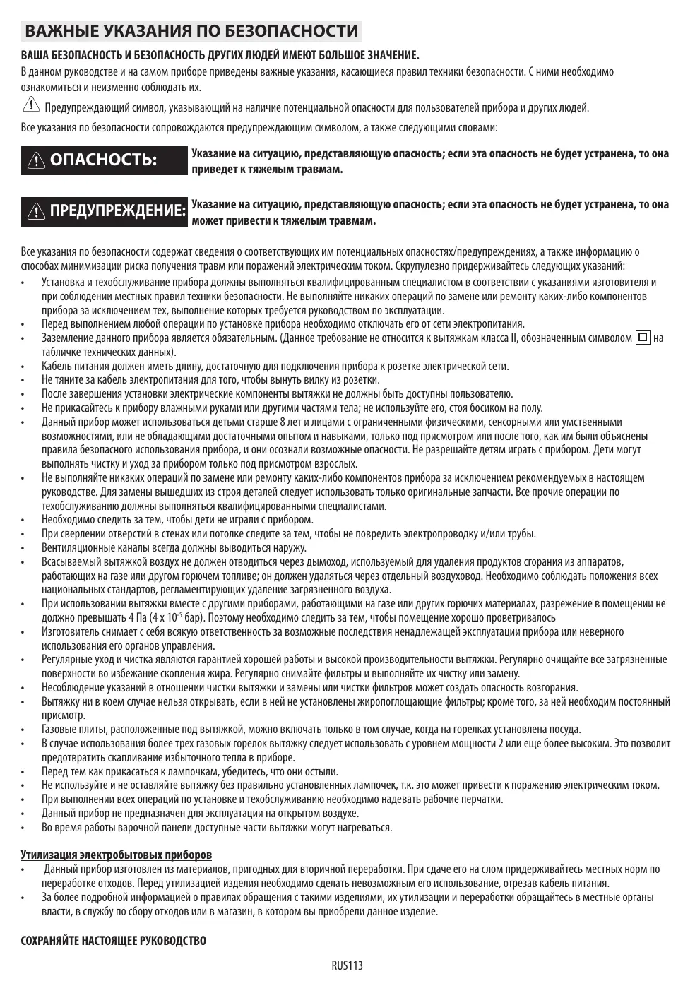 • L’installation et la maintenance doivent être confiées à un technicien spécialisé et exécutées conformément aux instructions du fabricant et aux normes locales de sécurité. Ne pas réparer ni remplacer les pièces de l’appareil qui ne sont pas spécifiquement indiquées dans le manuel d’utilisation. • Débrancher l’appareil de l’alimentation électrique avant de l’installer. • La mise à la terre de l’appareil est obligatoire. Elle n’est pas nécessaire pour les hottes de classe II qui portent le symbole sur l’étiquette signalétique. • Le cordon d’alimentation doit être suffisamment long pour permettre le branchement de l’appareil à la prise électrique. • Ne pas tirer sur le cordon d’alimentation de l’appareil pour le débrancher de la prise. • Une fois l’installation terminée, l’utilisateur ne doit plus pouvoir accéder aux composants électriques. • Ne pas toucher l’appareil quand on est mouillé ou pieds nus. • Cet appareil peut être utilisé par des enfants de plus de huit ans et par des adultes ayant des capacités physiques, sensorielles ou mentales réduites ou inexpérimentées à condition qu’ils soient sous la surveillance d’un responsable ou qu’ils aient reçu des instructions suffisantes pour en comprendre les dangers et assurer leur sécurité. Les enfants ne doivent pas jouer avec l’appareil. Le nettoyage et l’entretien ne doivent pas être confiés à des enfants sauf s’ils sont sous la surveillance d’un adulte. • Ne pas réparer ni remplacer les pièces de l’appareil qui sont pas spécifiquement indiquées dans le manuel. Les composants défectueux doivent être remplacés par des pièces d’origine. Toutes les autres opérations de maintenance doivent être exécutées par un technicien spécialisé. • Surveiller les enfants et vérifier qu’ils ne jouent pas avec l’appareil. • Veiller à ne pas endommager les branchements électriques ou les tuyaux en perçant des trous dans la cloison ou le plafond. • L’évacuation des conduites de ventilation doit déboucher sur l’extérieur. • L’évacuation d’air ne doit pas déboucher dans le conduit de fumée d’un appareil de combustion au gaz (ou autre combustible) mais dans un conduit indépendant. Respecter les normes nationales relatives à l’évacuation des fumées dans l’atmosphère. • Si la hotte est utilisée en même temps que des appareils alimentés au gaz (ou autre combustible), la dépression dans la pièce ne doit pas dépasser 4 Pa (4 x 10-5 bar) S’assurer que la pièce est correctement ventilée. • Le fabricant décline toute responsabilité pour les dommages résultant d’une utilisation impropre ou d’un réglage erroné des commandes. • Un entretien et un nettoyage réguliers garantissent le bon fonctionnement et le rendement de la hotte. Nettoyer régulièrement les dépôts sur les surfaces sales pour éviter l’accumulation des graisses. Enlever et nettoyer ou remplacer fréquemment le filtre. • Le non respect des normes d’entretien de la hotte, de remplacement et de nettoyage des filtres, peut provoquer un incendie. • La hotte d’aspiration de la vapeur ne doit pas être ouverte si les filtres à graisse ne sont pas installés et doit être constamment surveillée. • Les appareils à gaz ne peuvent être utilisés sous la hotte d’aspiration que si une casserole est posée dessus. • Si plus de trois points de cuisson au gaz sont utilisés en même temps, la hotte doit être réglée au moins sur la puissance 2. Ce réglage permet d’éviter la stagnation de chaleur dans l’appareil. • S’assurer que les lampes sont froides avant de les toucher. • Ne pas utiliser la hotte sans les lampes ou si elles ne sont pas installées correctement pour éviter tout risque l’électrocution. • Porter des gants de travail pour les opérations d’installation et d’entretien. • Cet appareil n’est pas conçu pour être utilisé à l’extérieur • Lorsque la table de cuisson fonctionne, les parties accessibles de la hotte peuvent devenir très chaudes. Mise au rebut des appareils électroménagers • Cet appareil a été fabriqué avec des matériaux recyclables ou réutilisables. Mettre l’appareil au rebut conformément aux normes locales d’élimination des déchets. Avant d’éliminer l’appareil, le rendre inutilisable en coupant le cordon d’alimentation. • Pour toute information sur le traitement, la récupération et le recyclage des appareils électroménagers, s’adresser à l’administration locale compétente, au service de collecte des déchets ou au magasin où il a été acheté CONSERVER CES INSTRUCTIONS F15