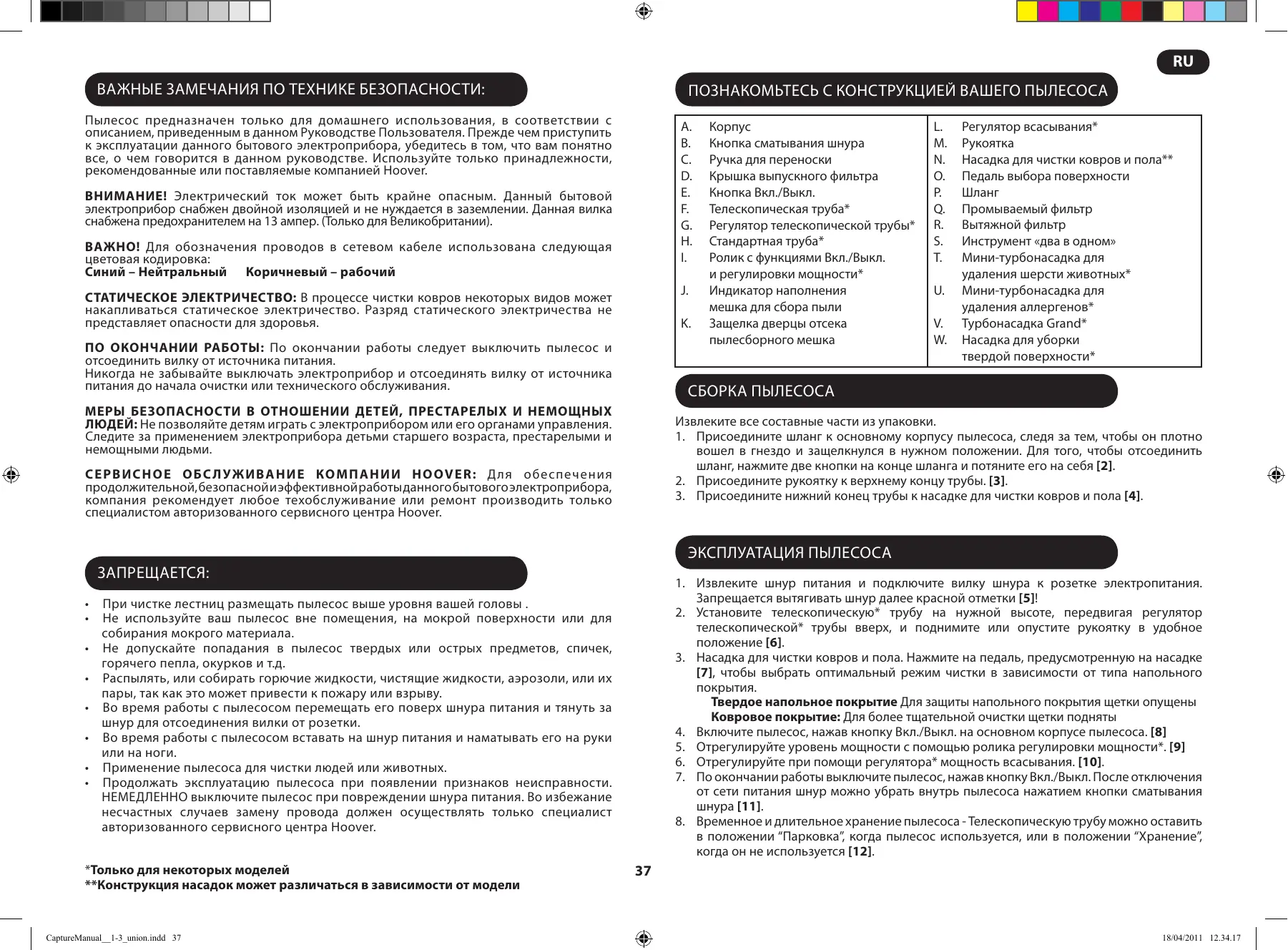 в положении “Парковка”, когда пылесос используется, или в положении “Хранение”, когда он не используется [12]. При чистке лестниц размещать пылесос выше уровня вашей головы . Не используйте ваш пылесос вне помещения, на мокрой поверхности или для собирания мокрого материала. Не допускайте попадания в пылесос твердых или острых предметов, спичек, горячего пепла, окурков и т.д. Распылять, или собирать горючие жидкости, чистящие жидкости, аэрозоли, или их пары, так как это может привести к пожару или взрыву. Во время работы с пылесосом перемещать его поверх шнура питания и тянуть за шнур для отсоединения вилки от розетки. Во время работы с пылесосом вставать на шнур питания и наматывать его на руки или на ноги. Применение пылесоса для чистки людей или животных. Продолжать эксплуатацию пылесоса при появлении признаков неисправности. НЕМЕДЛЕННО выключите пылесос при повреждении шнура питания. Во избежание несчастных случаев замену провода должен осуществлять только специалист авторизованного сервисного центра Hoover. *Только для некоторых моделей **Конструкция насадок может различаться в зависимости от модели CaptureManual__1-3_union.indd 37