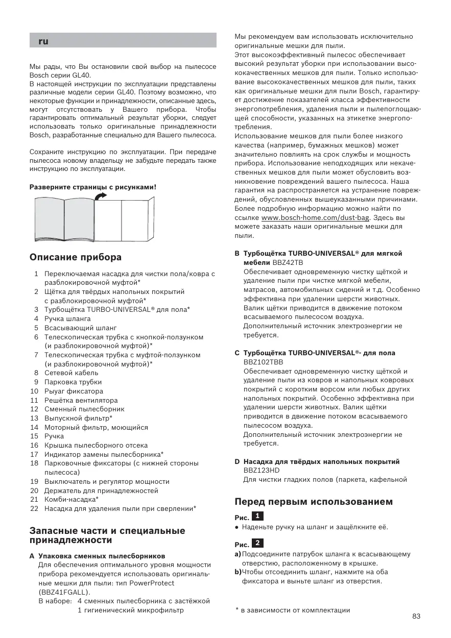 Мы рады, что Вы остановили свой выбор на пылесосе Bosch серии GL40. В настоящей инструкции по эксплуатации представлены различные модели серии GL40. Поэтому возможно, что некоторые функции и принадлежности, описанные здесь, могут отсутствовать у Вашего прибора. Чтобы гарантировать оптимальный результат уборки, следует использовать только оригинальные принадлежности Bosch, разработанные специально для Вашего пылесоса. Сохраните инструкцию по эксплуатации. При передаче пылесоса новому владельцу не забудьте передать также инструкцию по эксплуатации. Разверните страницы с рисунками! Описание прибора 1 Переключаемая насадка для чистки пола/ковра с разблокировочной муфтой* 2 Щётка для твёрдых напольных покрытий с разблокировочной муфтой* 3 Турбощётка TURBO-UNIVERSAL® для пола* 4 Ручка шланга 5 Всасывающий шланг 6 Телескопическая трубка с кнопкой-ползунком (и разблокировочной муфтой)* 7 Телескопическая трубка с муфтой-ползунком (и разблокировочной муфтой)* 8 Сетевой кабель 9 Парковка трубки 10 Рыуаг фиксатора 11 Решётка вентилятора 12 Сменный пылесборник 13 Выпускной фильтр* 14 Моторный фильтр, моющийся 15 Ручка 16 Крышка пылесборного отсека 17 Индикатор замены пылесборника* 18 Парковочные фиксаторы (с нижней стороны 19 Выключатель и регулятор мощности 20 Держатель для принадлежностей 21 Комби-насадка* 22 Насадка для удаления пыли при сверлении* Запасные части и специальные принадлежности A Упаковка сменных пылесборников Для обеспечения оптимального уровня мощности прибора рекомендуется использовать оригинальные мешки для пыли: тип PowerProtect (BBZ41FGALL). В наборе: 4 сменных пылесборника с застёжкой 1 гигиенический микрофильтр Мы рекомендуем вам использовать исключительно оригинальные мешки для пыли. Этот высокоэффективный пылесос обеспечивает высокий результат уборки при использовании высококачественных мешков для пыли. Только использование высококачественных мешков для пыли, таких как оригинальные мешки для пыли Bosch, гарантирует достижение показателей класса эффективности энергопотребления, удаления пыли и пылепоглощающей способности, указанных на этикетке энергопотребления. Использование мешков для пыли более низкого качества (например, бумажных мешков) может значительно повлиять на срок службы и мощность прибора. Использование неподходящих или некачественных мешков для пыли может обусловить возникновение повреждений вашего пылесоса. Наша гарантия на распространяется на устранение повреждений, обусловленных вышеуказанными причинами. Более подробную информацию можно найти по ссылке www.bosch-home.com/dust-bag. Здесь вы можете заказать наши оригинальные мешки для B Турбощётка TURBO-UNIVERSAL® для мягкой мебели BBZ42TB Обеспечивает одновременную чистку щёткой и удаление пыли при чистке мягкой мебели, матрасов, автомобильных сидений и т.д. Особенно эффективна при удалении шерсти животных. Валик щётки приводится в движение потоком всасываемого пылесосом воздуха. Дополнительный источник электроэнергии не C Турбощётка TURBO-UNIVERSAL®- для пола BBZ102TBB Обеспечивает одновременную чистку щёткой и удаление пыли из ковров и напольных ковровых покрытий с коротким ворсом или любых других напольных покрытий. Особенно эффективна при удалении шерсти животных. Валик щётки приводится в движение потоком всасываемого пылесосом воздуха. Дополнительный источник электроэнергии н