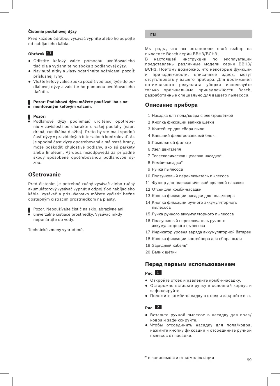 эксплуатации представлены различные модели серии BBH3/ BCH3. Поэтому возможно, что некоторые функции и принадлежности, описанные здесь, могут отсутствовать у вашего прибора. Для достижения оптимального результата уборки используйте только оригинальные принадлежности Bosch, разработанные специально для вашего пылесоса. Описание прибора 1 Насадка для пола/ковра с электрощёткой Pozor: Podlahové dýzy podliehajú určitému opotrebeniu v závislosti od charakteru vašej podlahy (napr. drsná, rustikálna dlažba). Preto by ste mali spodnú časť dýzy v pravidelných intervaloch kontrolovať. Ak je spodná časť dýzy opotrebovaná a má ostré hrany, môže poškodiť chúlostivé podlahy, ako sú parkety alebo linoleum. Výrobca nezodpovedá za prípadné škody spôsobené opotrebovanou podlahovou dýzou. 2 Кнопка фиксации валика щётки 3 Контейнер для сбора пыли 4 Внешний фильтровальный блок 5 Ламельный фильтр 6 Узел двигателя 7 Телескопическая щелевая насадка* 8 Комби-насадка* 9 Ручка пылесоса Ošetrovanie Pred čistením je potrebné ručný vysávač alebo ručný akumulátorový vysávač vypnúť a odpojiť od nabíjacieho kábla. Vysávač a príslušenstvo môžete vyčistiť bežne dostupným čistiacim prostriedkom na plasty.