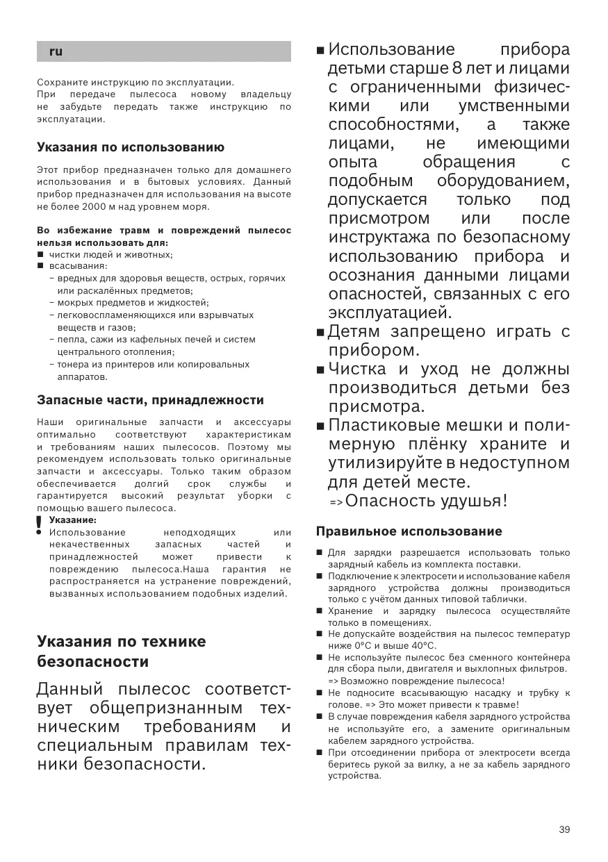 не забудьте передать также инструкцию по эксплуатации. Указания по использованию Этот прибор предназначен только для домашнего использования и в бытовых условиях. Данный прибор предназначен для использования на высоте не более 2000 м над уровнем моря. Во избежание травм и повреждений пылесос нельзя использовать для: чистки людей и животных; всасывания: − вредных для здоровья веществ, острых, горячих или раскалённых предметов; − мокрых предметов и жидкостей; − легковоспламеняющихся или взрывчатых веществ и газов; − пепла, сажи из кафельных печей и систем центрального отопления; − тонера из принтеров или копировальных