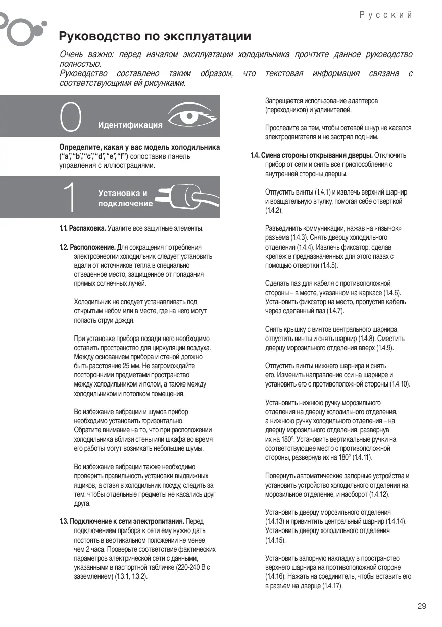 Draai de schroeven van de onderste scharnier los en verwijder die. Verander de positie van de as op de scharnier en plaats die aan de tegenovergestelde zijde (1.4.10) Plaats, 180° gedraaid, de onderste greep van de vriezer op de deur van de koelkast en plaats de onderste greep van de koelkast op die van de vriezer. Plaats de verticale handgrepen aan de tegenovergestelde zijden en draai die 180° (1.4.11). Draai de mechanismen voor automatisch sluiten en plaats die van de koelkast op de vriezer en vice versa (1.4.12). Plaats de deur van de vriezer (1.4.15) en de schroef de middelste scharnier vast (1.4.14). Plaats de deur van de koelkast (1.4.15). Plaats het afdichtkapje in de ruimte van de bovenste scharnier aan de tegenovergestelde zijde (1.4.16). Druk op het stekkertje om dat aan te sluiten op de deur (1.4.17).