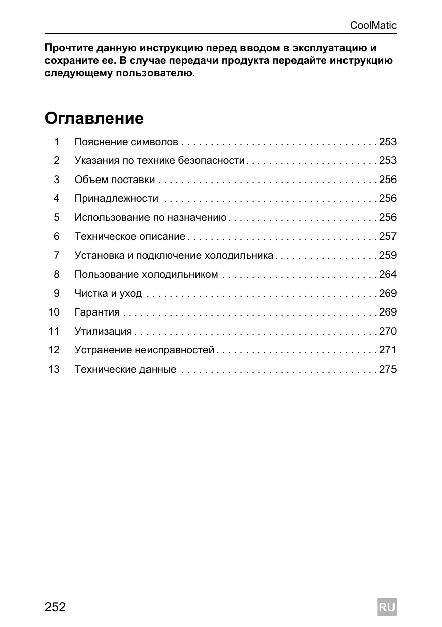Установка и подключение холодильника . . . . . . . . . . . . . . . . . . 259
